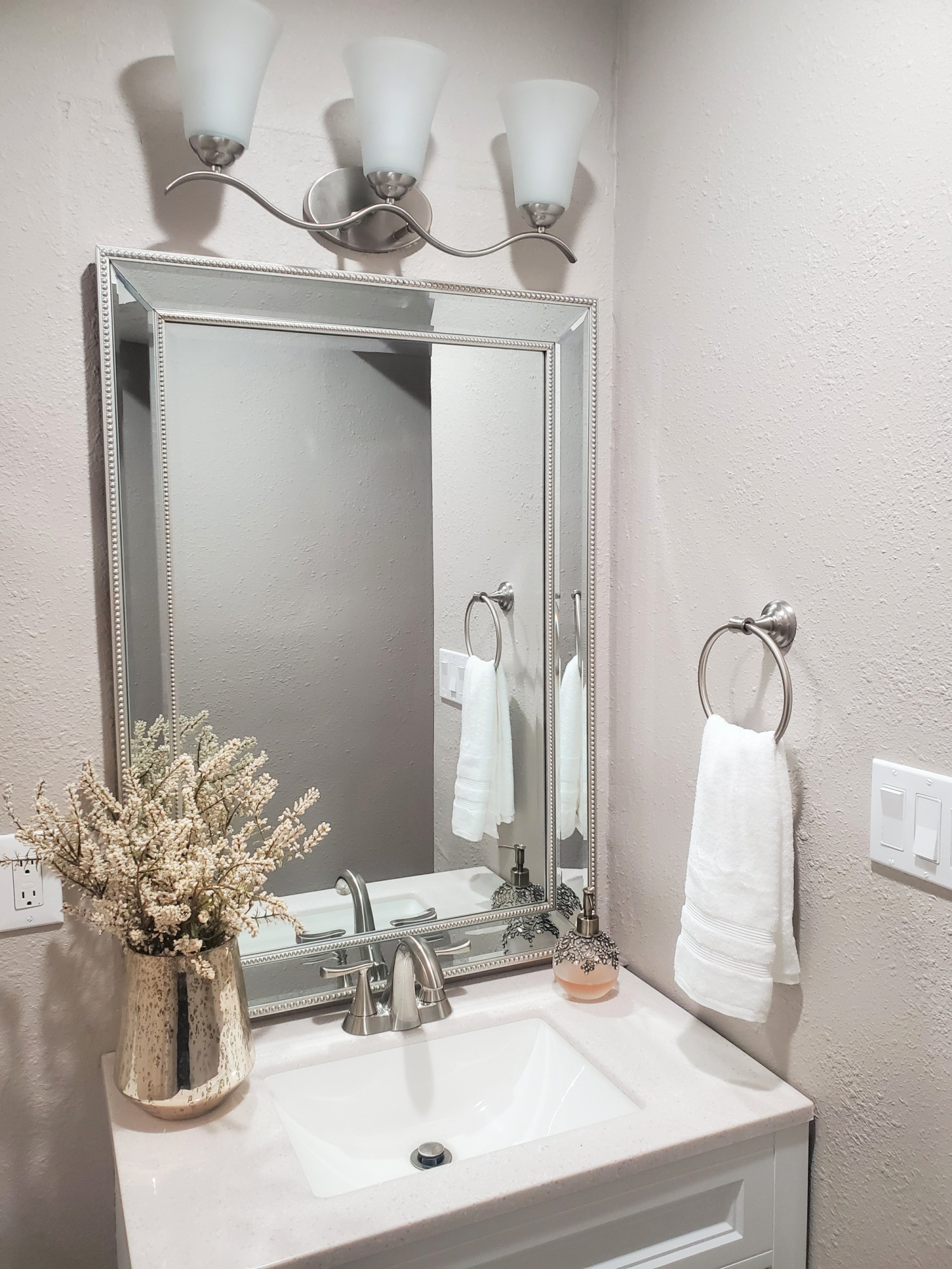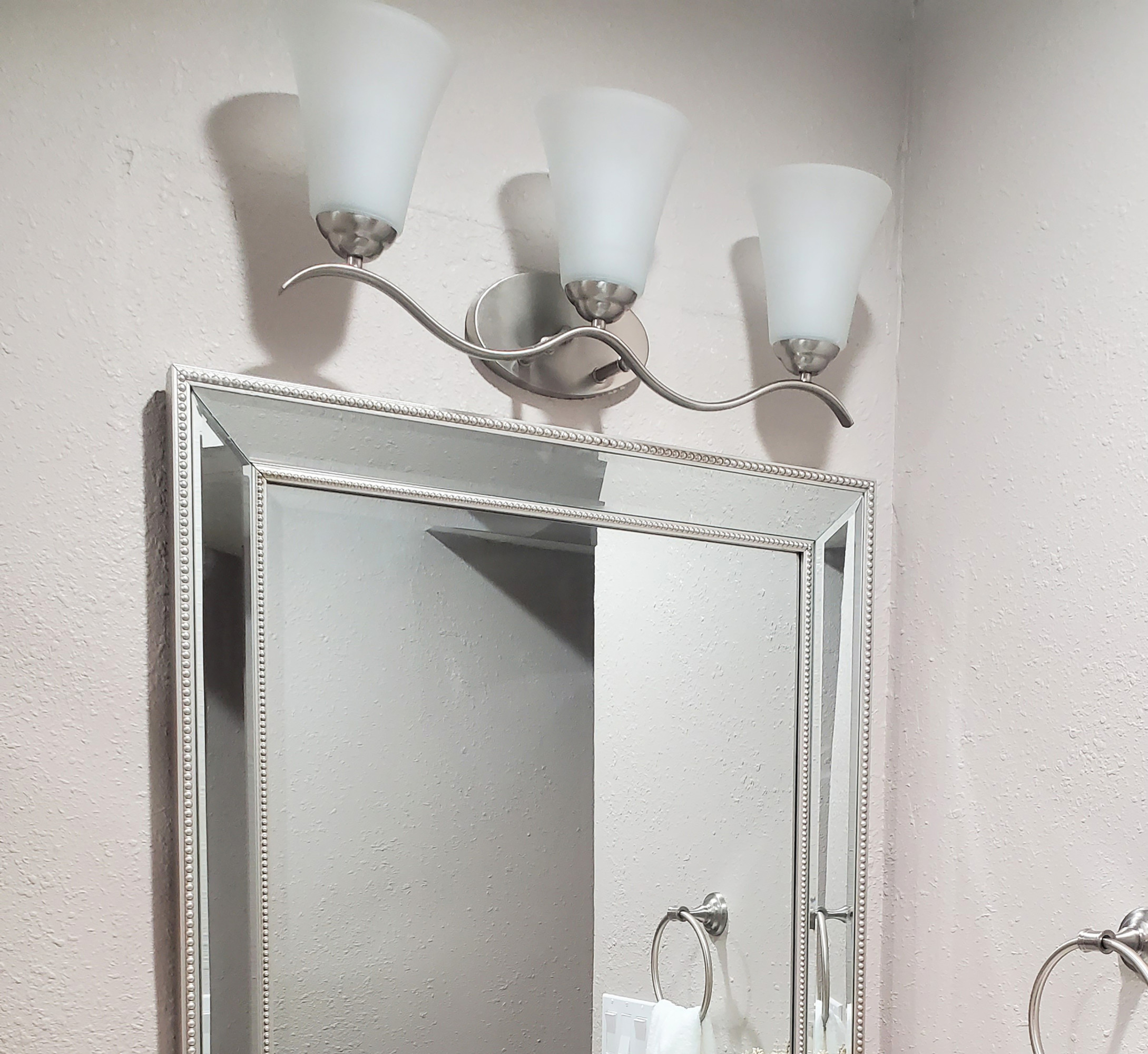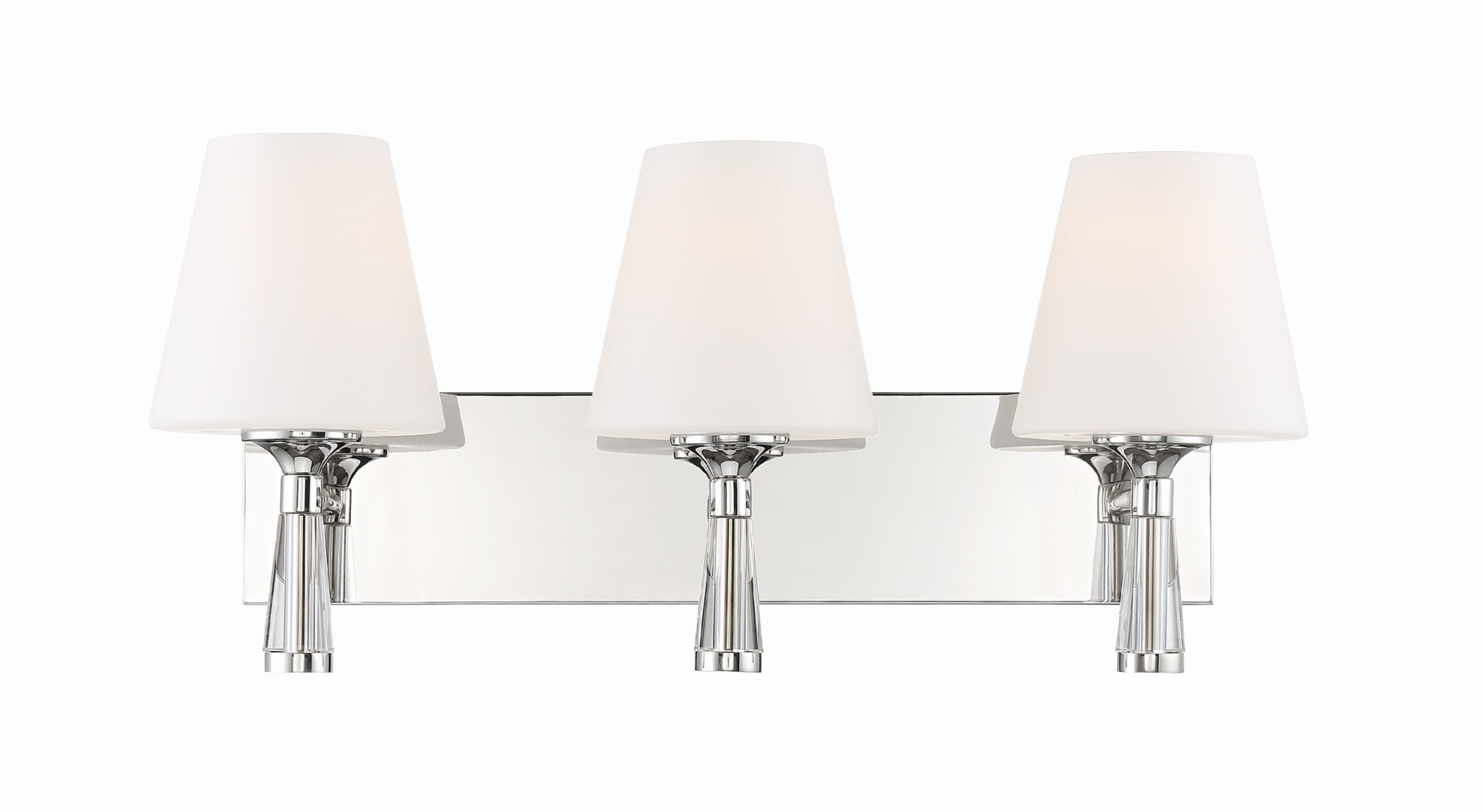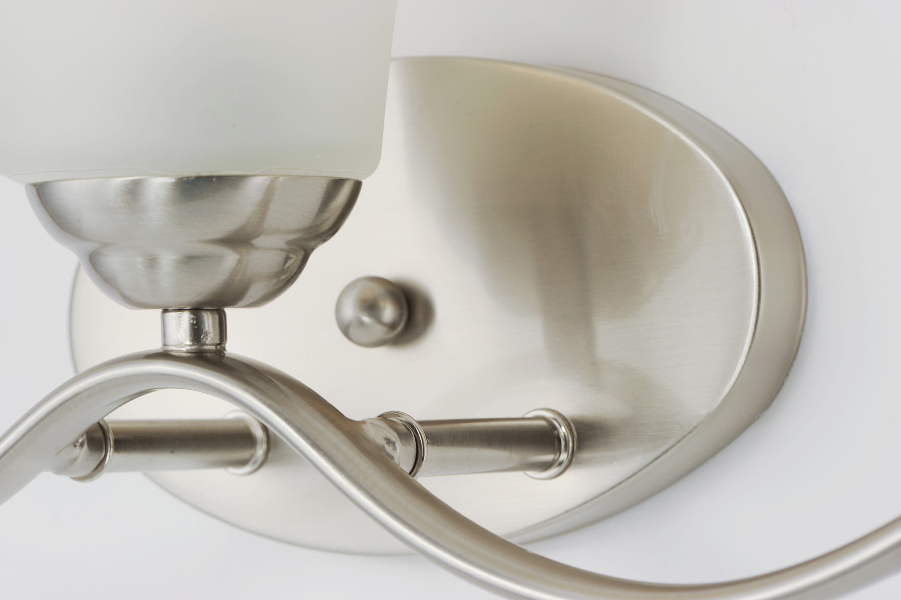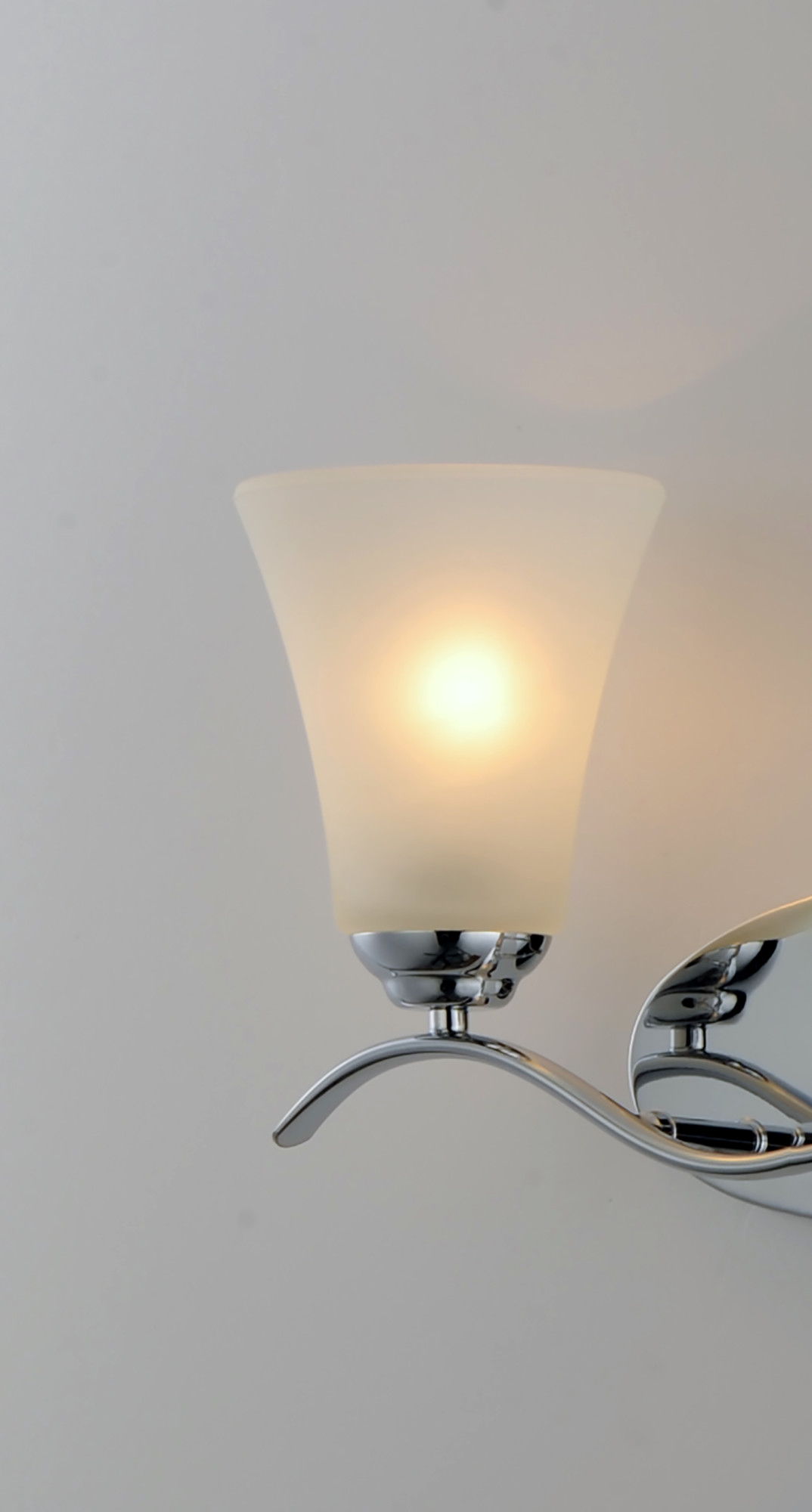 Item DescriptionGently waving arms of metallic color support tall-profile glass shades creating a scale normally not found in this category of lighting. The bath vanity may be installed up or down and also includes metallic finishes.