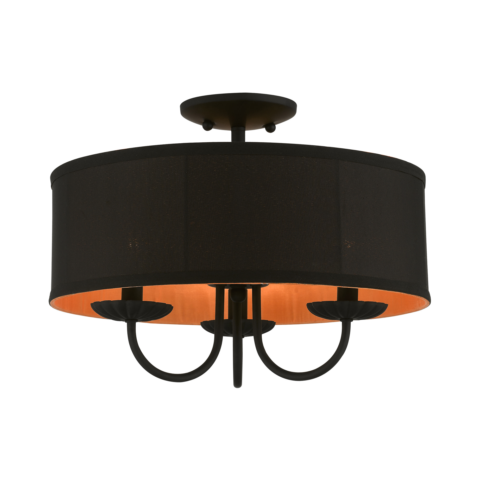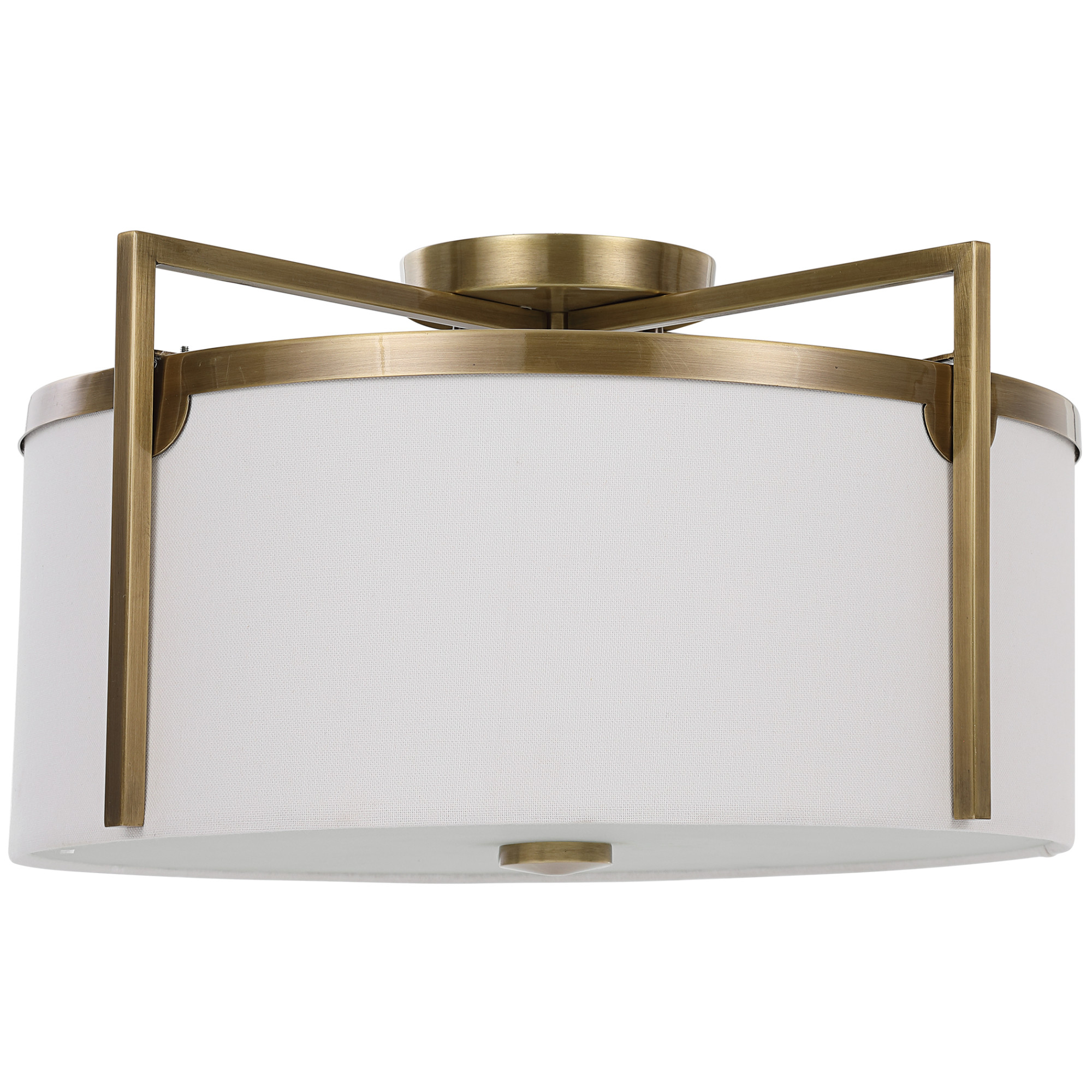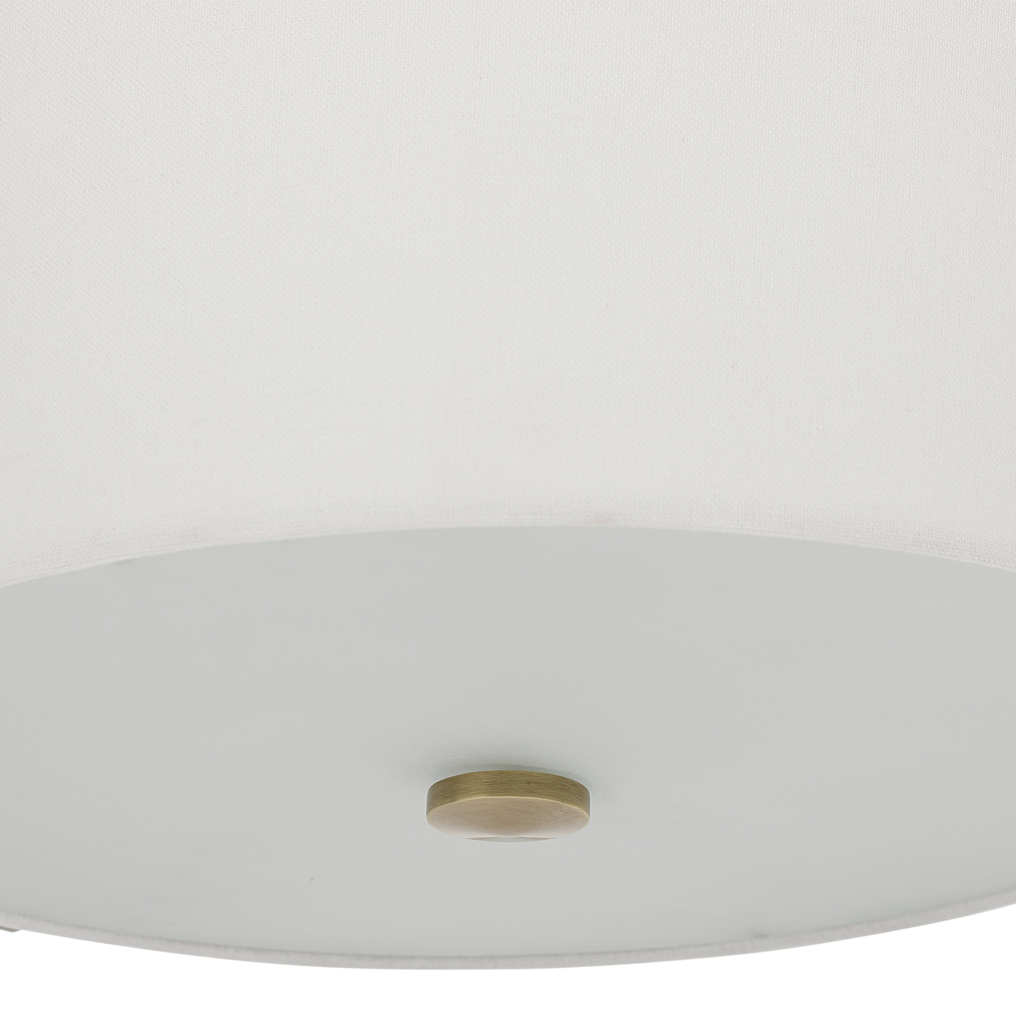 - Chic and versatile with clean lines, this semi flush mount features an antique brass finish with off white linen hard back shade with a central frosted glass diffuser