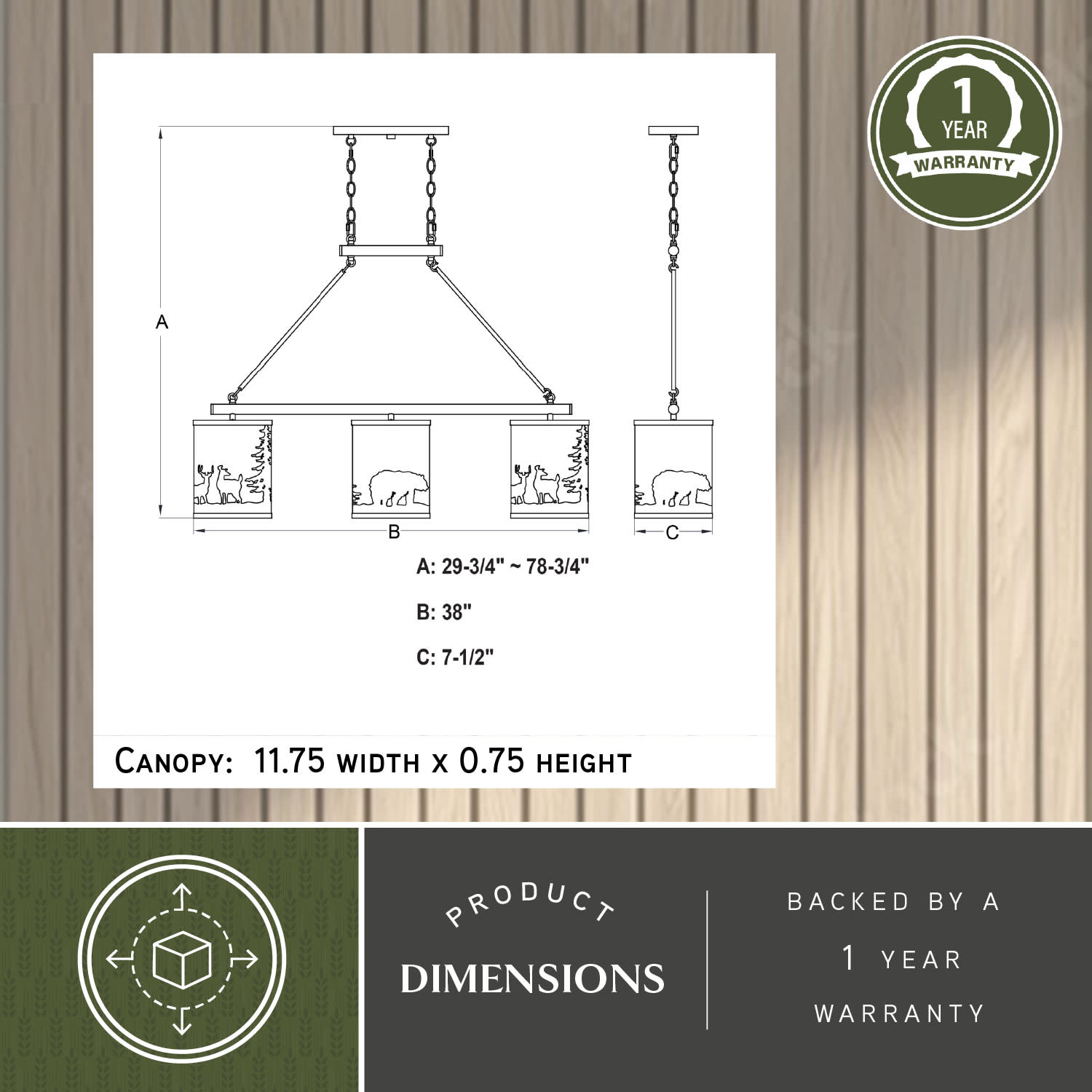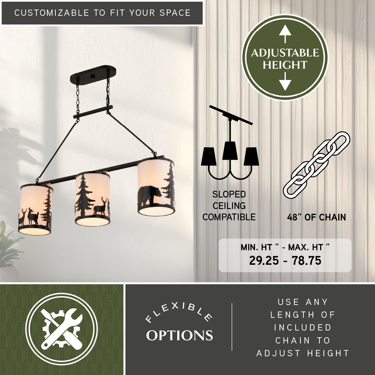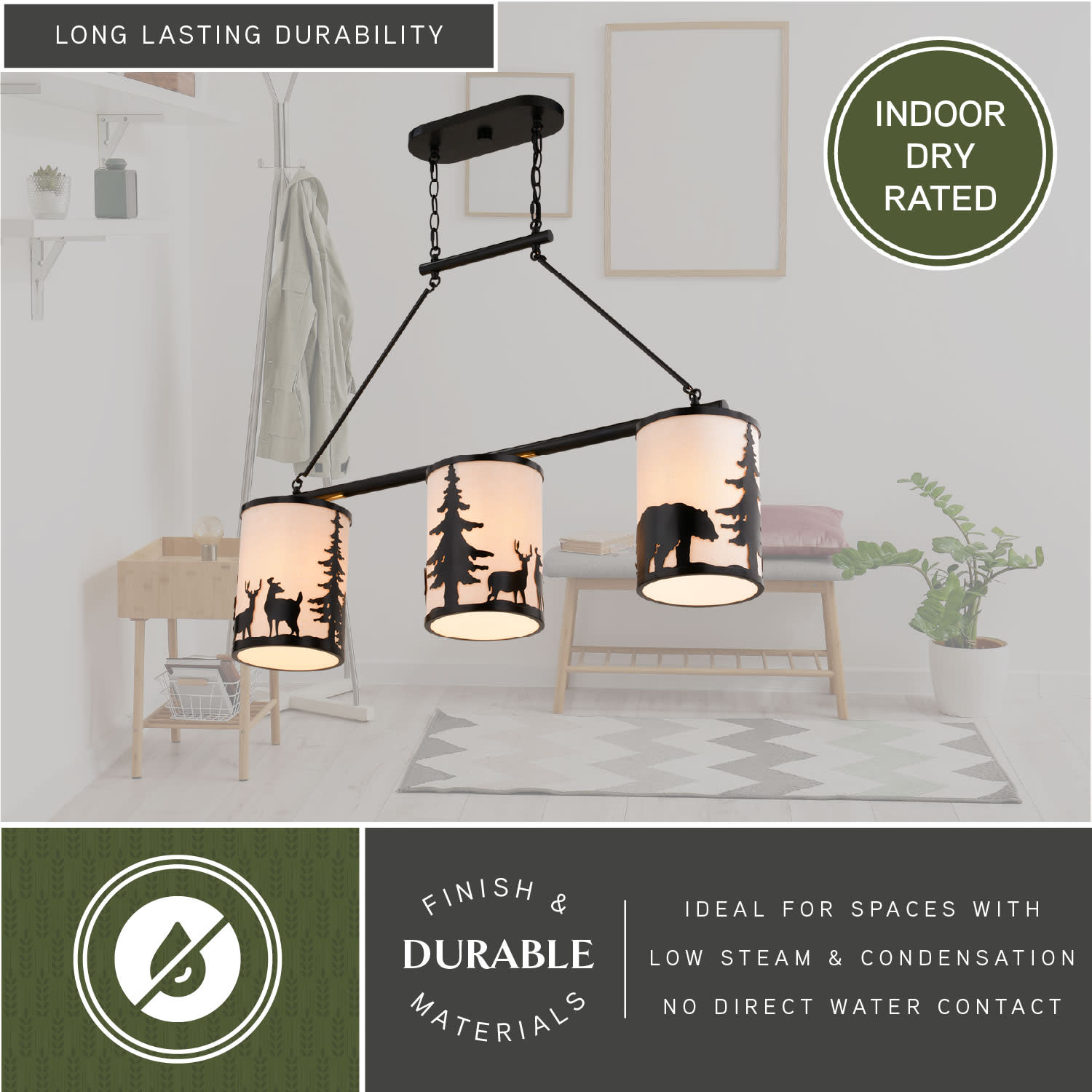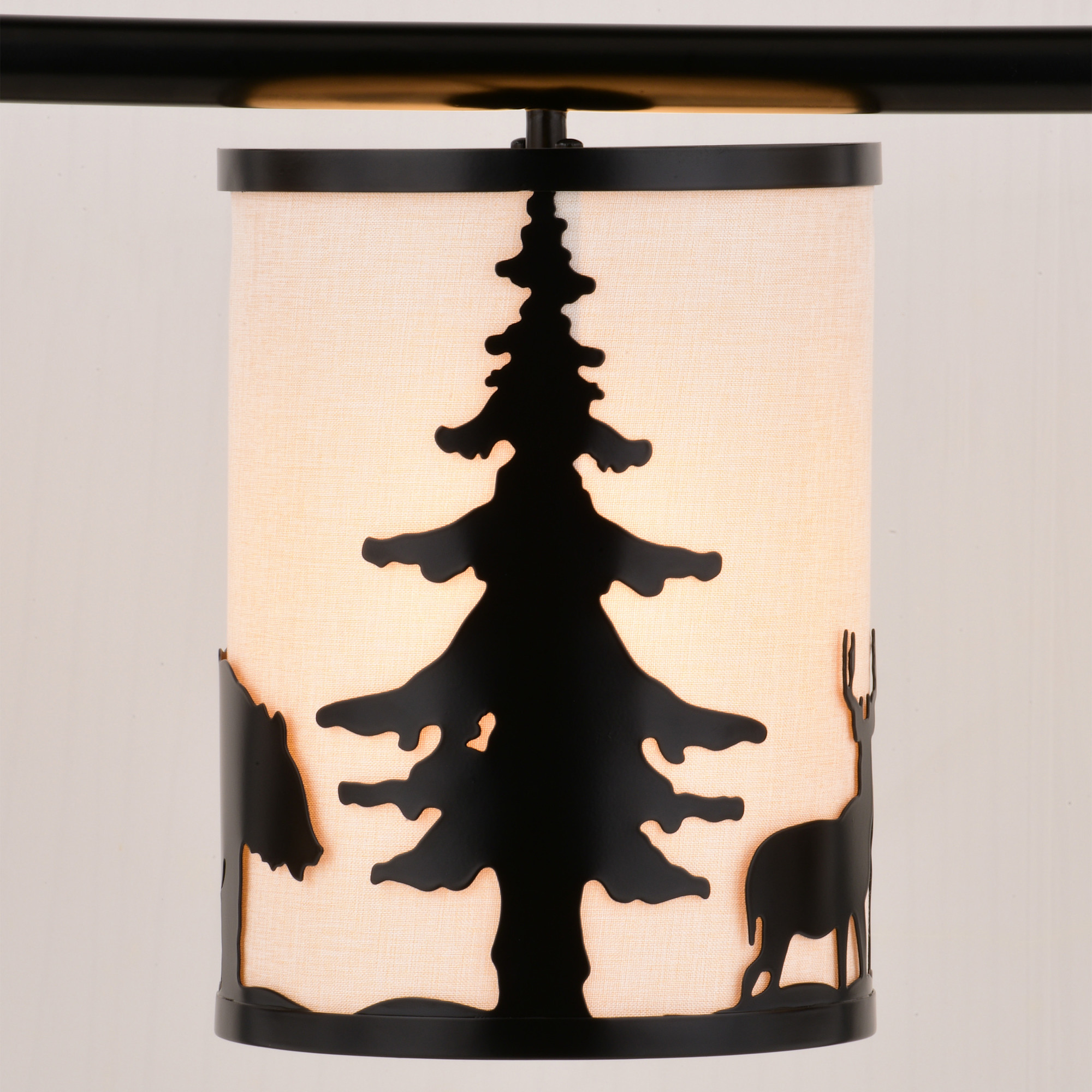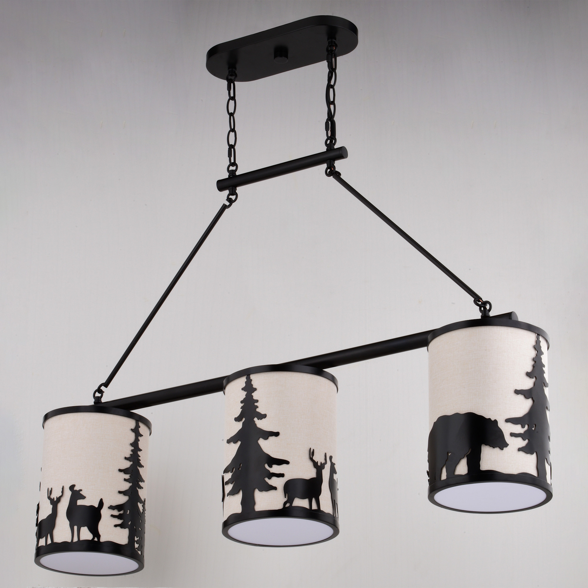 Item DescriptionEmbrace the serene whispers of the artfully crafted Acadia linear chandelier to bring the essence of the wild into your home. The Acadia's three lights and textured linen shades showcase bear and deer silhouettes set against a backdrop of evergreen trees. Perfect for kitchens or family rooms of cabins, lodges, or any home seeking to add a touch of nature and rustic ambiance.