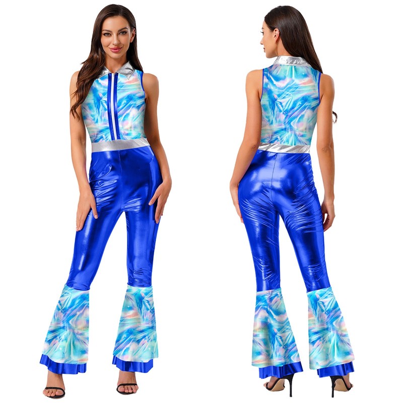 DE Damen Metallic Jumpsuit Glitzer 80er Jahre Hippie Disco Overall Clubwear