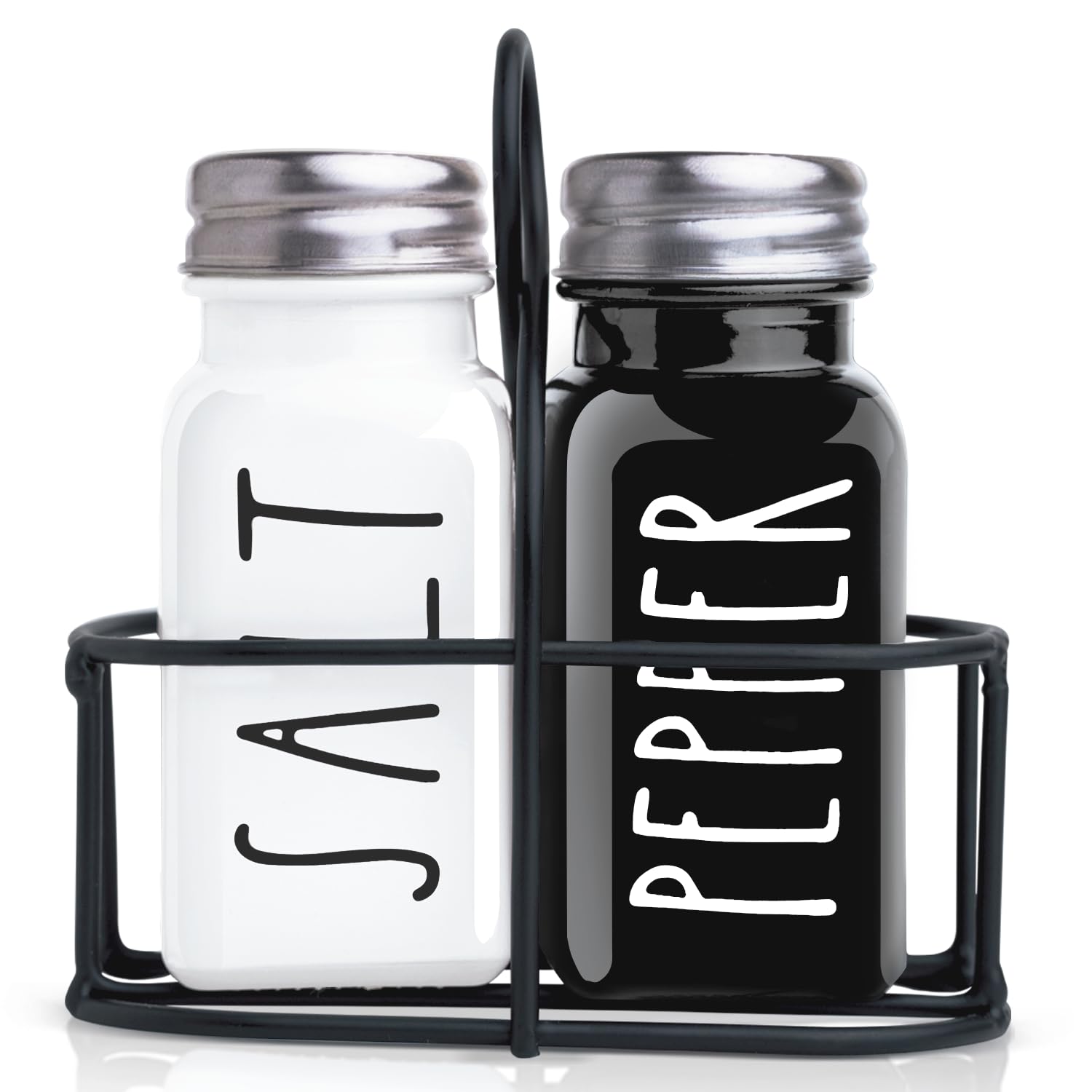 Holder included: The only farmhouse salt an pepper shaker set that includes a cute black metal holder that definitely complements the black and white shakers, brings order and prevents accidents.