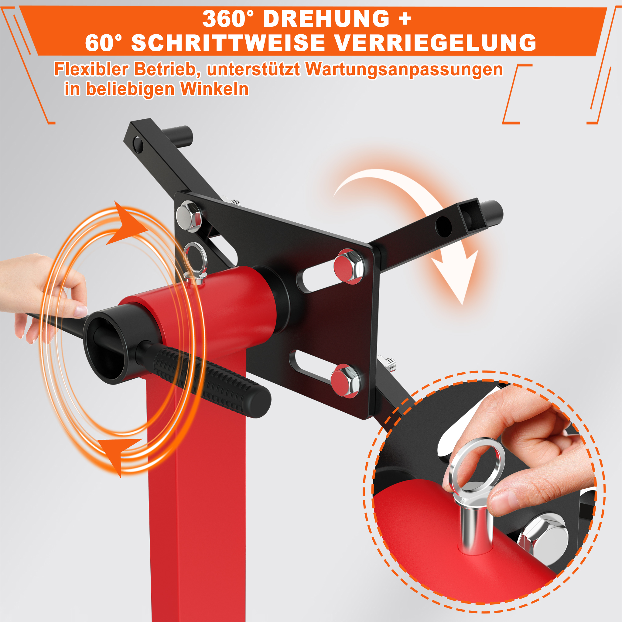 🔄【Drehbarer Motorhalter】Ein besonderes Highlight des Motorständers ist die vollständig drehbare Aufnahmeplatte, die Sie problemlos um 360° drehen können, um jeden Winkel des Motors oder Getriebes optimal zu erreichen. Zusätzlich kann die Platte in 60°-Schritten arretierbar werden, sodass Sie sie in der gewünschten Position fixieren können – perfekt für Arbeiten an schwer zugänglichen Bereichen wie Kabeln, Schrauben oder Ventilen. Dadurch sparen Sie Zeit und Mühe, da Sie den Motor nicht ständig umstellen müssen, sondern die Aufnahmeplatte anpassen.