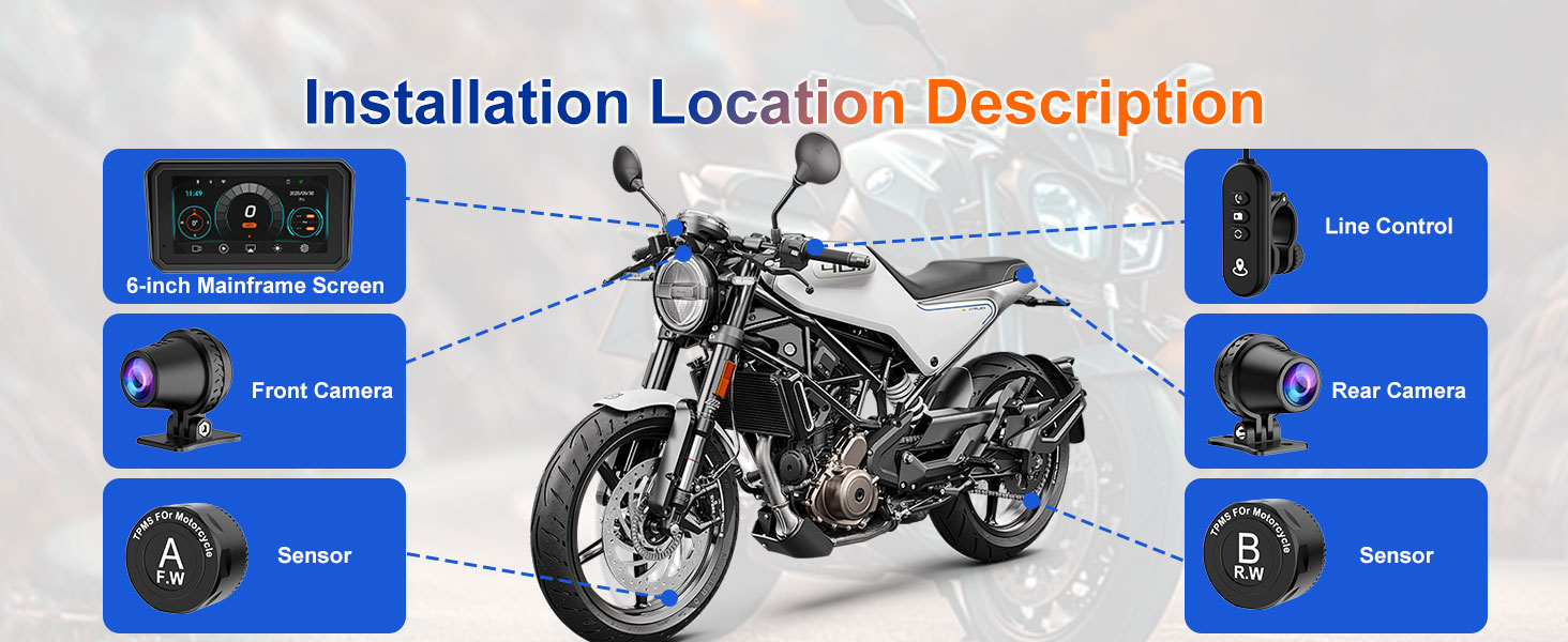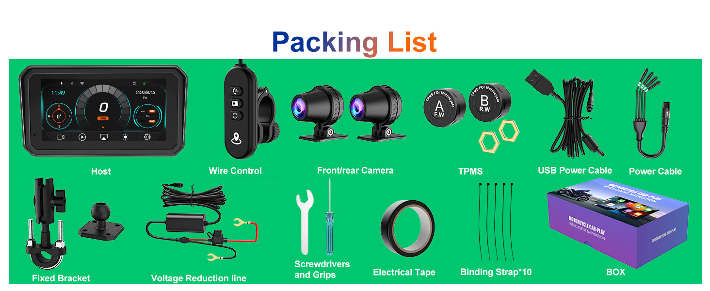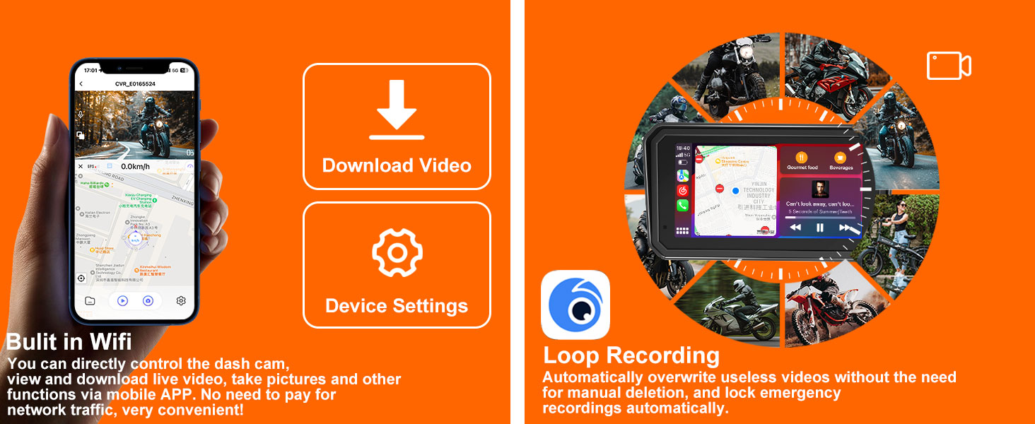 【6-Inch IPS Motorcycle Screen with TPMS Sensor】This dash cam for motorcycle carplay unit features a 6-inch IPS screen with 1440x720 resolution, wide viewing angle and high contrast for clear images. Built-in WiFi lets you control the dash cam by app to view, download and take photos, integrating a compact motorcycle camera system and motorcycle gps navigation system gps para motos.