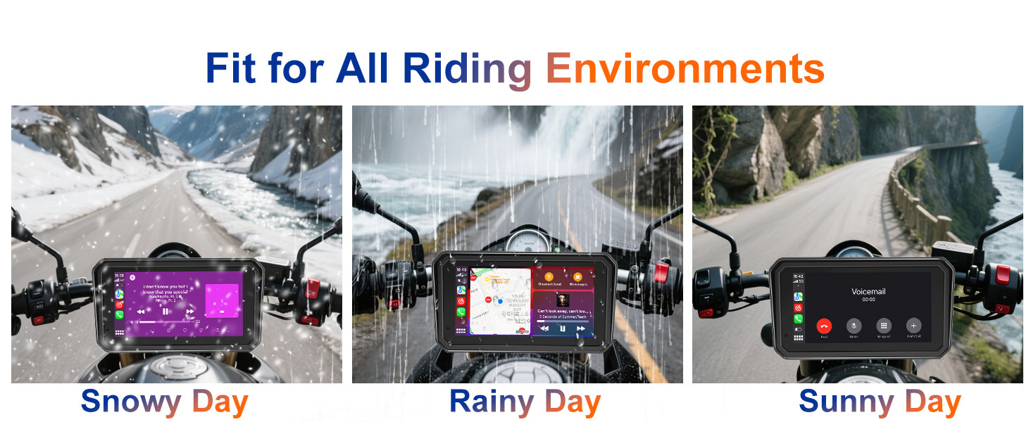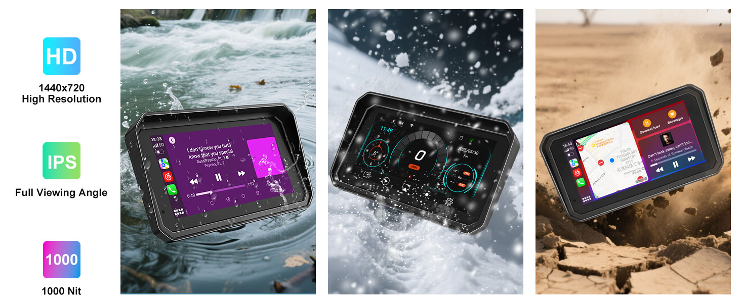【1000 Nits Brightness Ultimate Riding Visibility】30% brightness boost. 1000 nits ensures clear navigation with motorcycle gps navigation system and gps para motos in all weather. IP68 waterproof QLED motorcycle carplay screen pantalla para moto delivers vivid motorcycle music visuals. Anti-glare improves safety. Ideal motorcycle accessories for men, integrating motorcycle camera system as dash cam for motorcycle and motorcycle video recorder, perfect for motorcycle carplay with camera.