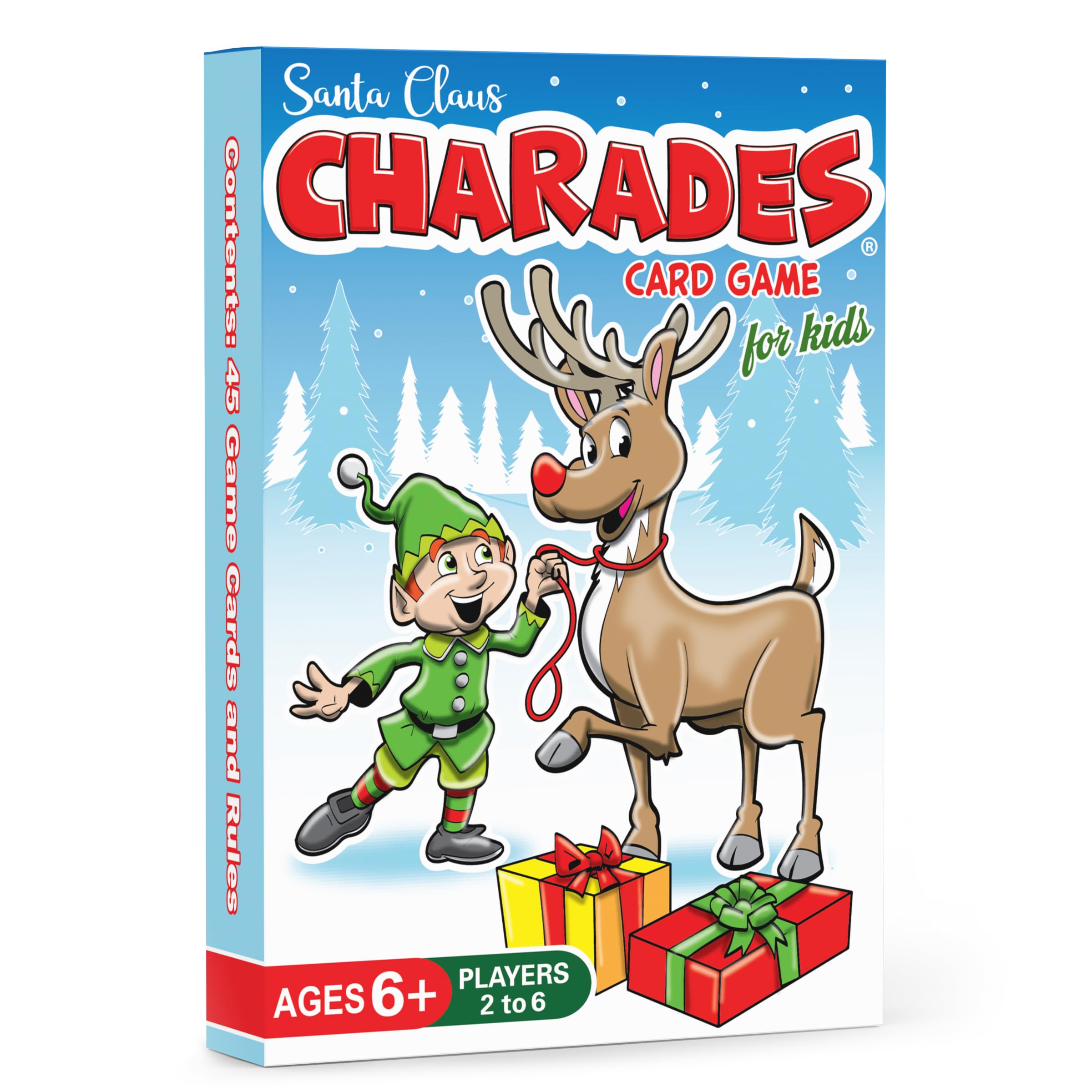 - Christmas Charades: Santa Claus Charades is a delightful game for both kids and adults to enjoy together. Featuring 45 Christmas-themed game cards with 90 total acting choices (2 per card), it's the perfect as a Stocking Stuffers or gift idea
