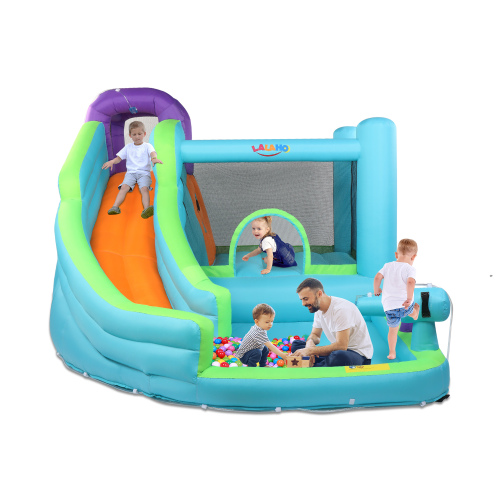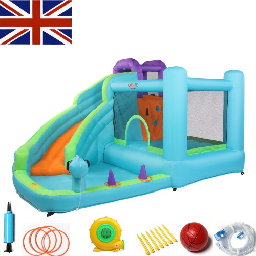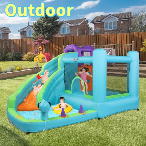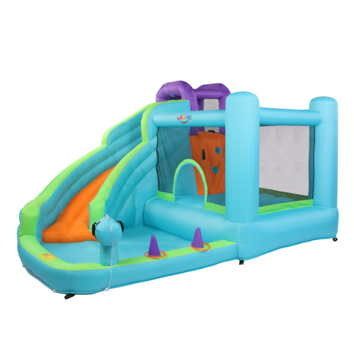【Multiple Play Areas】This inflatable house combines various functions and recreational activities for children. It includes a long slide, a water play pool, a baskerball rim allowing children to enjoy multiple games at the same time, creating a joyful childhood.