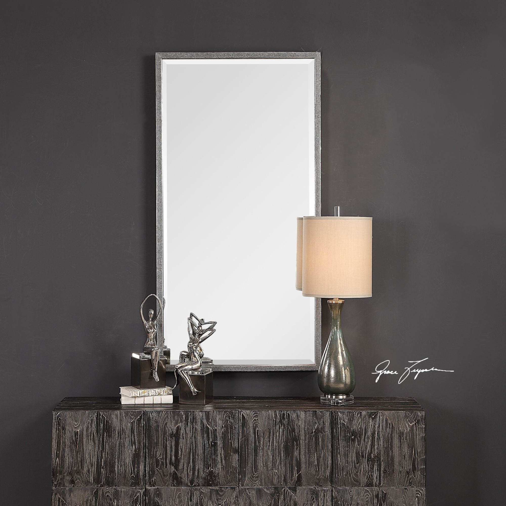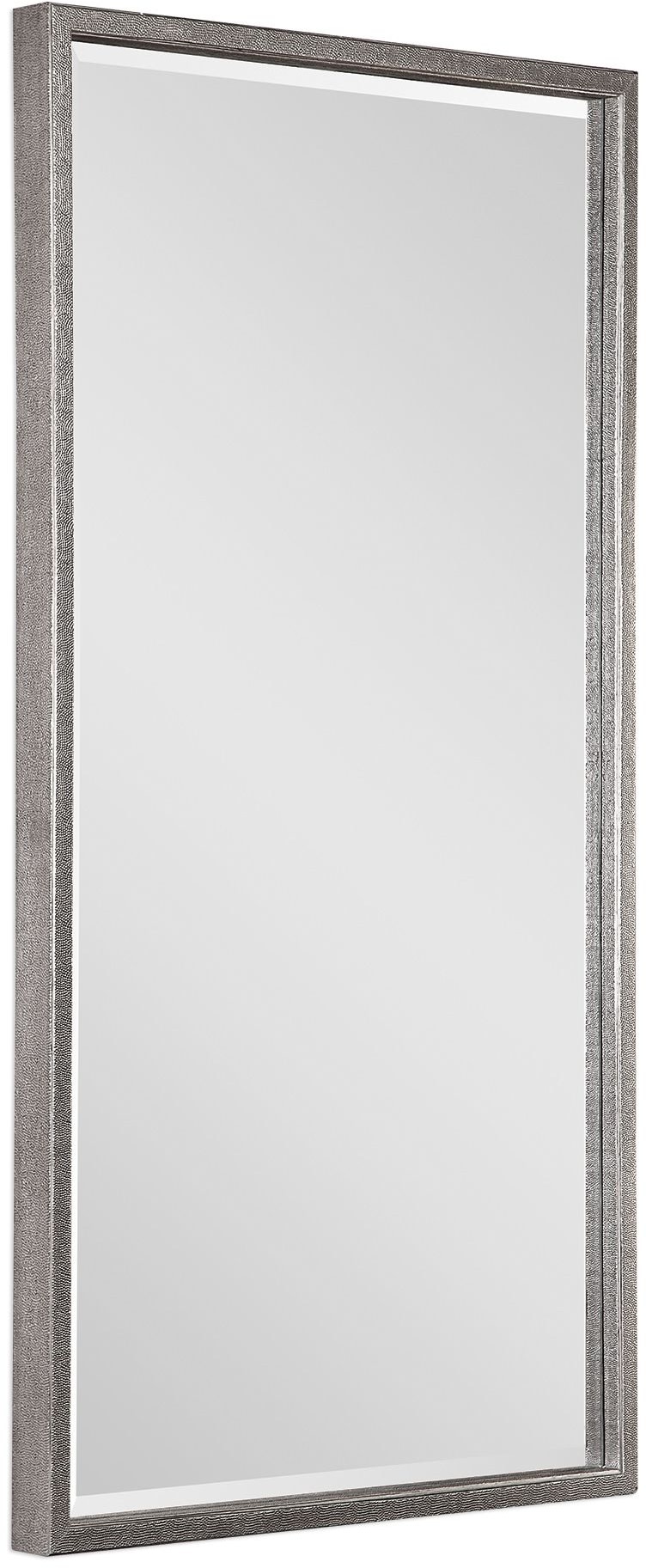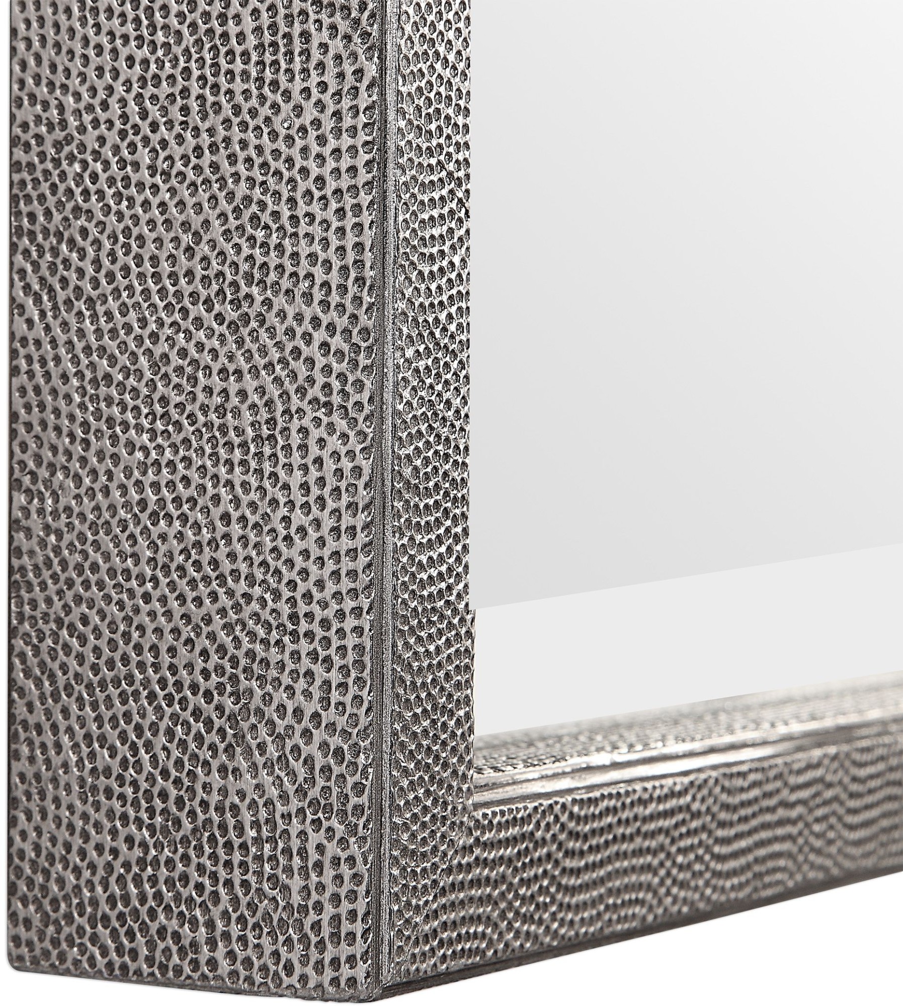 Item DescriptionThis contemporary design features a hammered texture on all sides over a linear profile, finished in a lightly antiqued metallic silver. Mirror features a generous 1 1/4" bevel. May be hung horizontal or vertical.