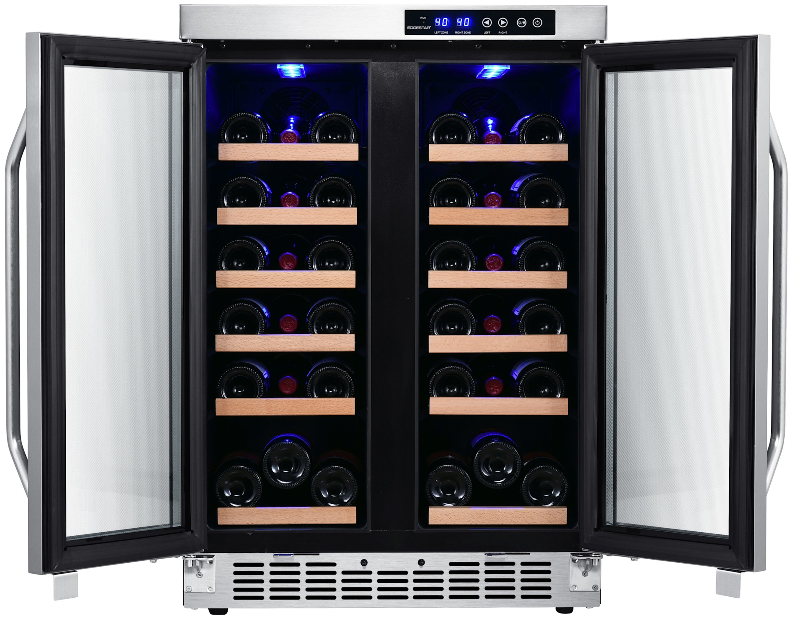 - Elegant French doors featuring tempered glass and wood trimmed shelves make this contemporary wine refrigerator a great match for any décor