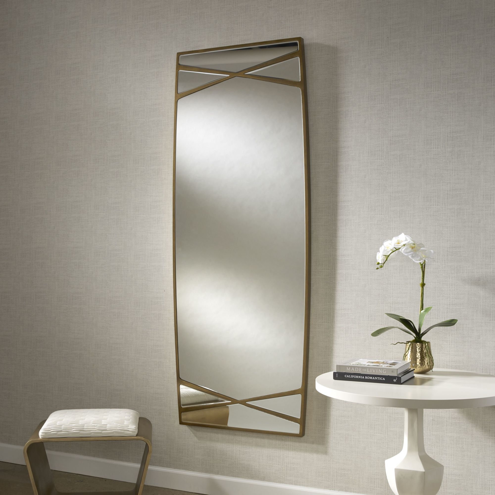 - Sure to make an elegant statement, this oversized mirror sports a curved silhouette in an antique gold finish with crossed details