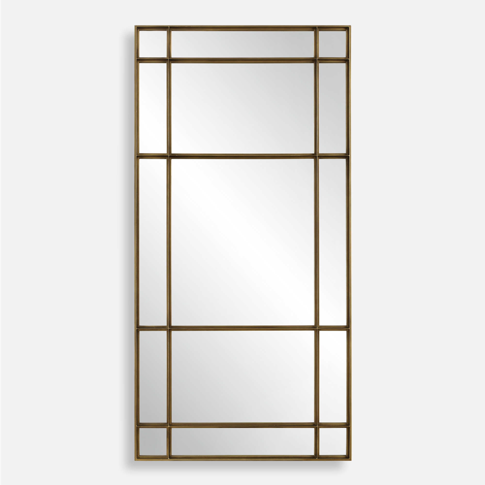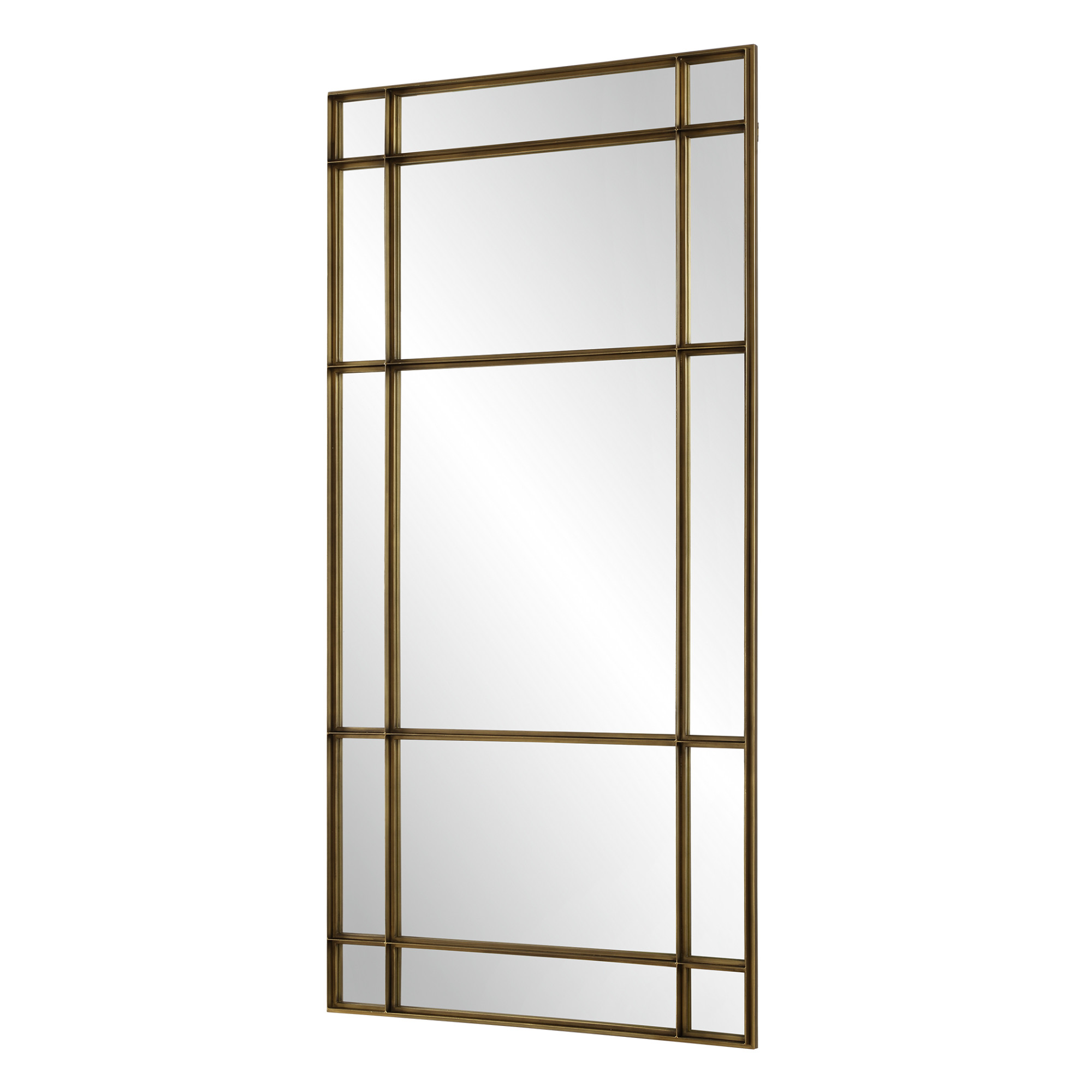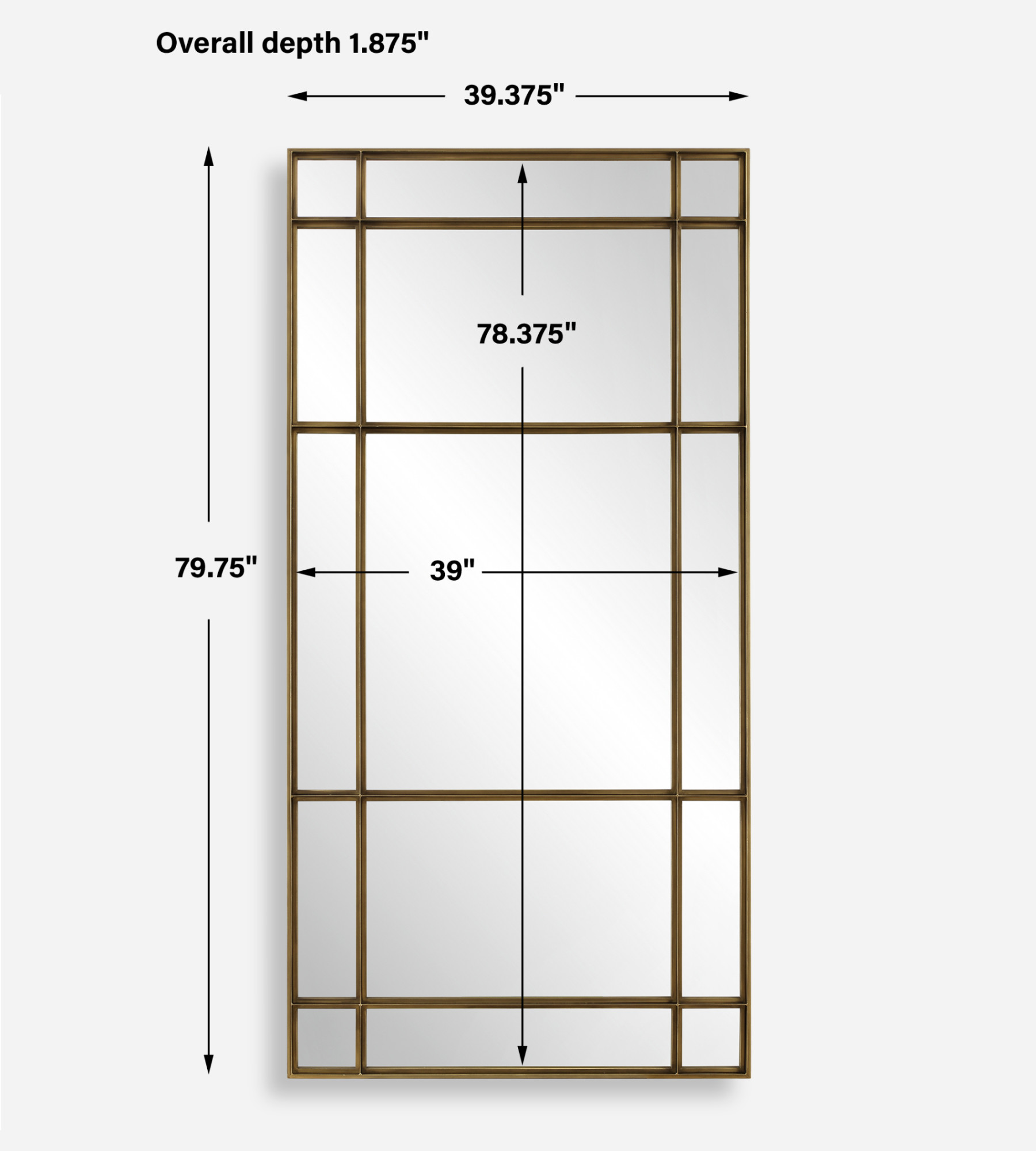 Item DescriptionThis oversized mirror features a heavy iron frame with deep channels reminiscent of vintage warehouse windows. It adds a touch of industrial charm and timeless elegance to any room.