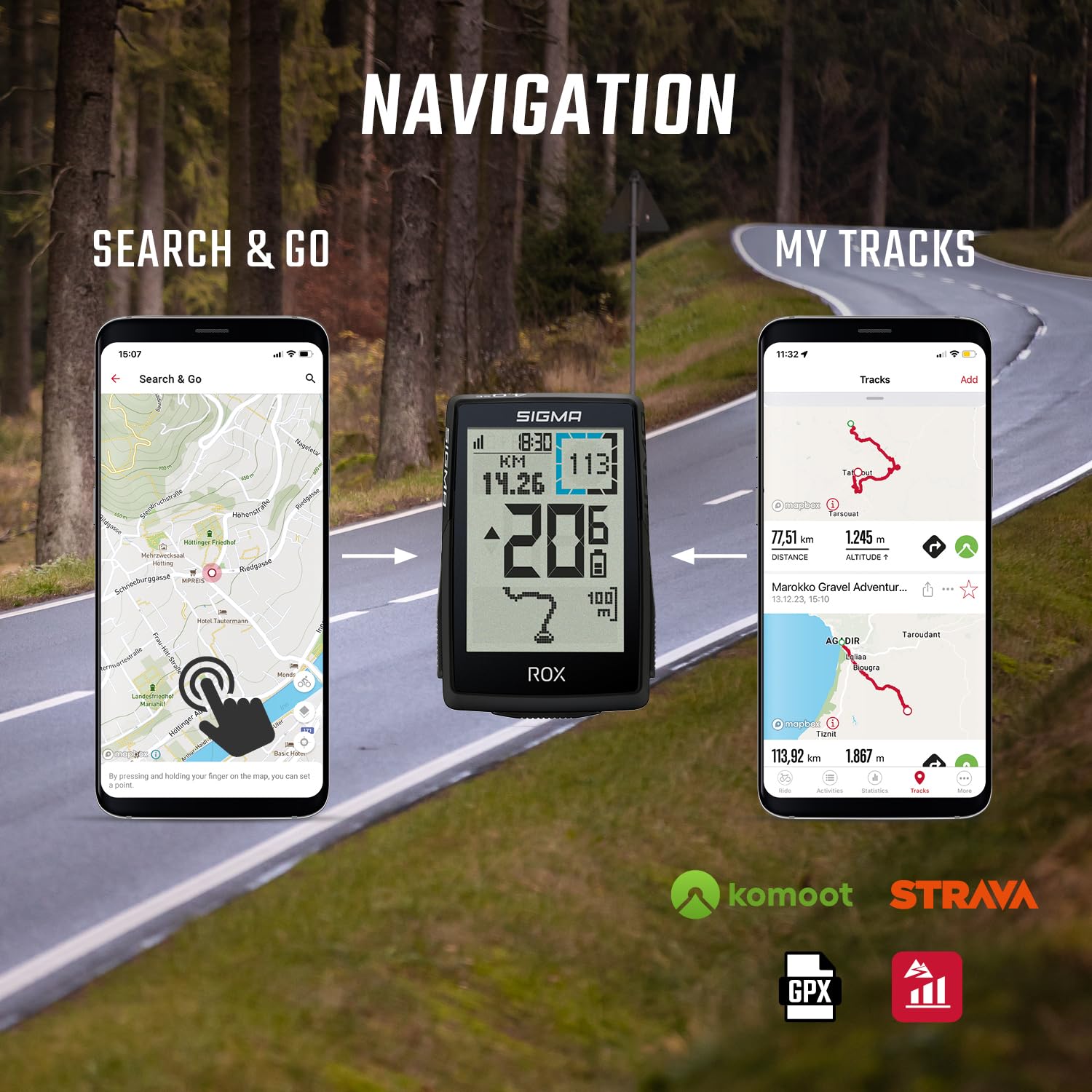 SEARCH & GO - la navigazione intelligente in 1 punto - Con il ROX 4.0 SE, i ciclisti possono trovare e navigare rapidamente verso qualsiasi luogo. A tal fine, possono inserire un indirizzo nell'app SIGMA RIDE sul proprio smartphone o cliccare su un punto qualsiasi della mappa.