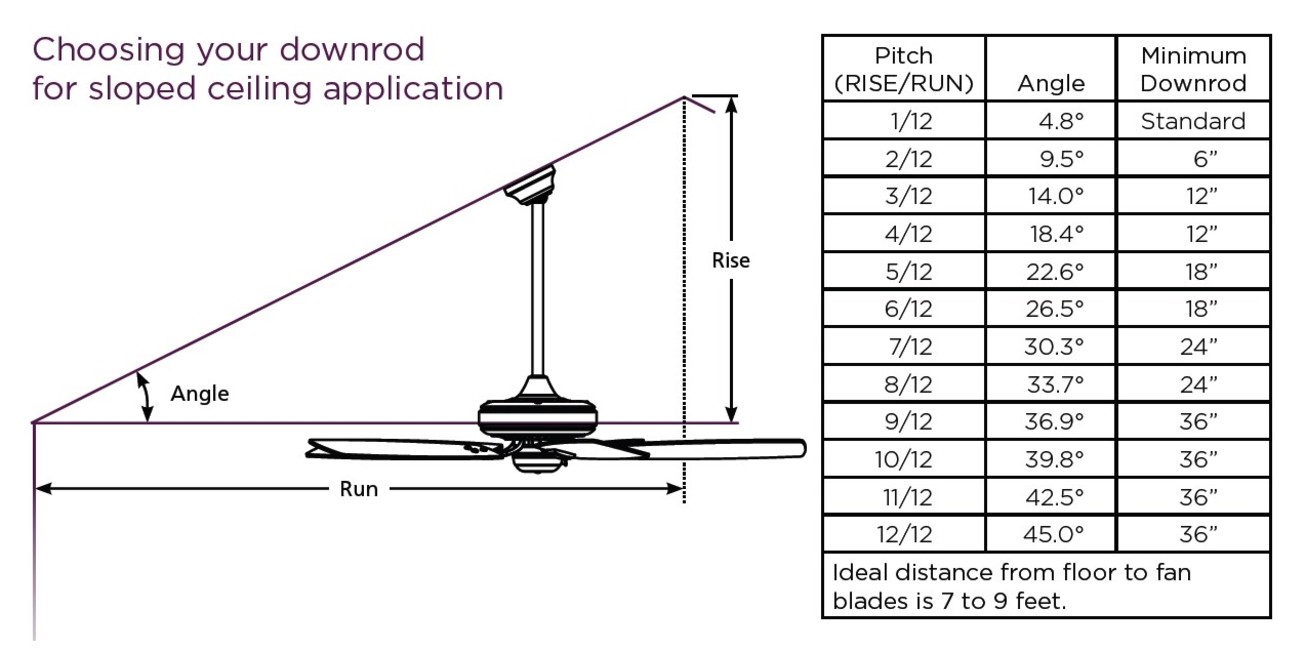 - Fan can be installed on sloped ceilings up to 30° right out of the box. For ceilings up to 52° you'll need to purchase the SCB1-52 sloped ceiling adapter and a minimum 12" downrod, both of which are offered upon adding this fan to your cart.