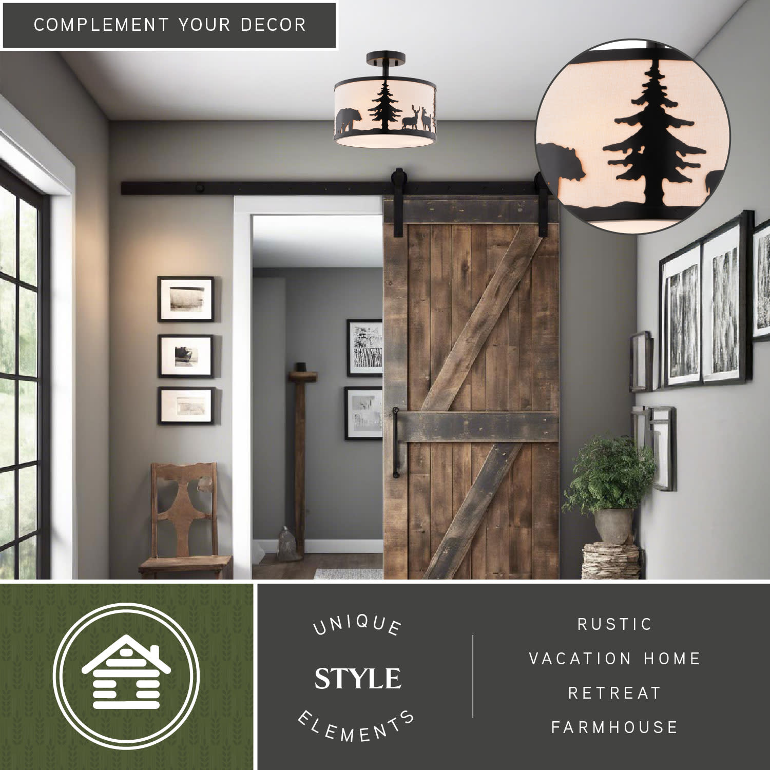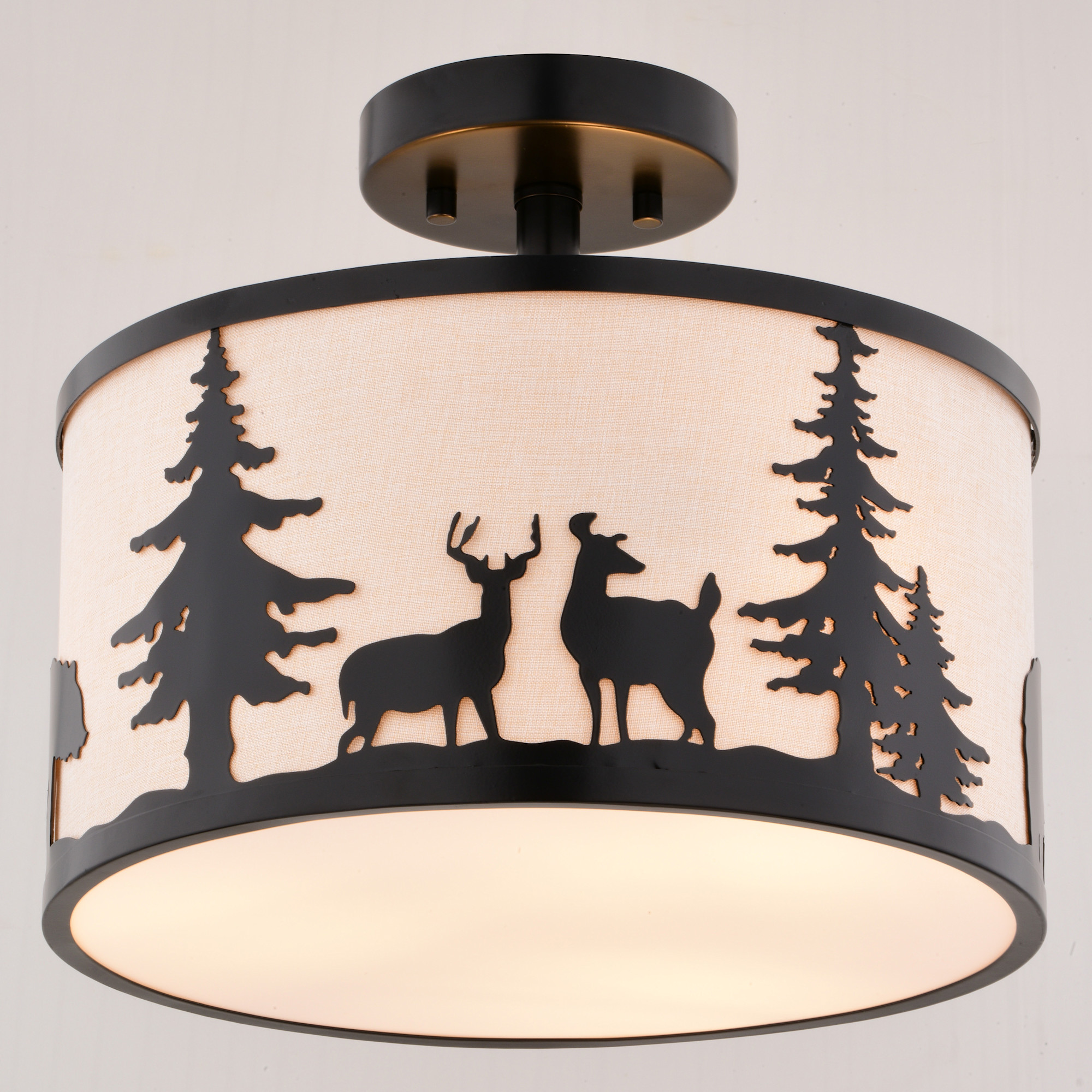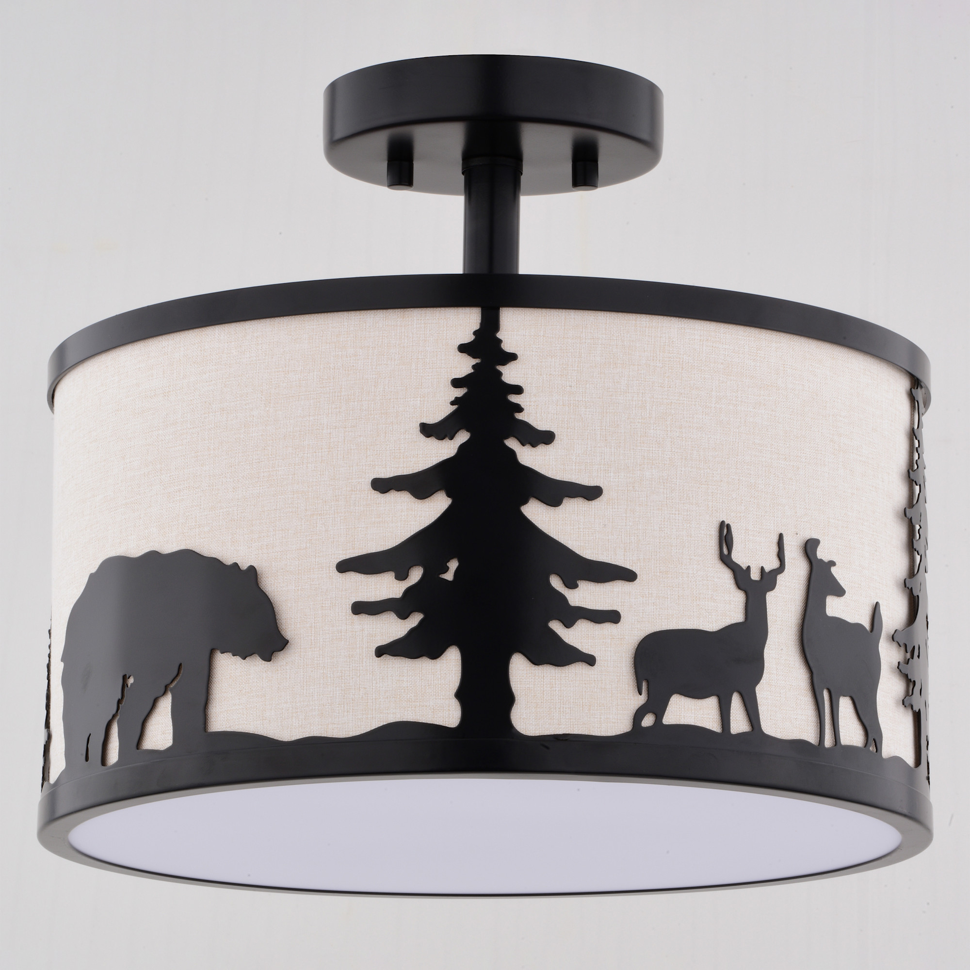 Item DescriptionEmbrace the serene whispers of the artfully crafted Acadia semi-flush ceiling light to bring the essence of the wild into your home. The Acadia's three lights and textured linen drum shade showcase bear and deer silhouettes set against a backdrop of evergreen trees. Perfect for kitchens or family rooms of cabins, lodges, or any home seeking to add a touch of nature and rustic ambiance.