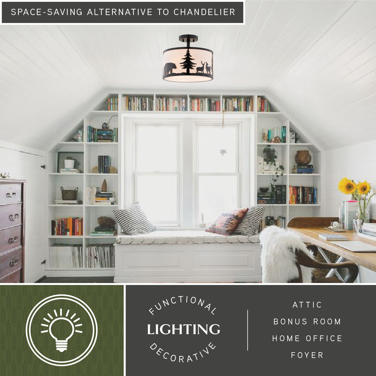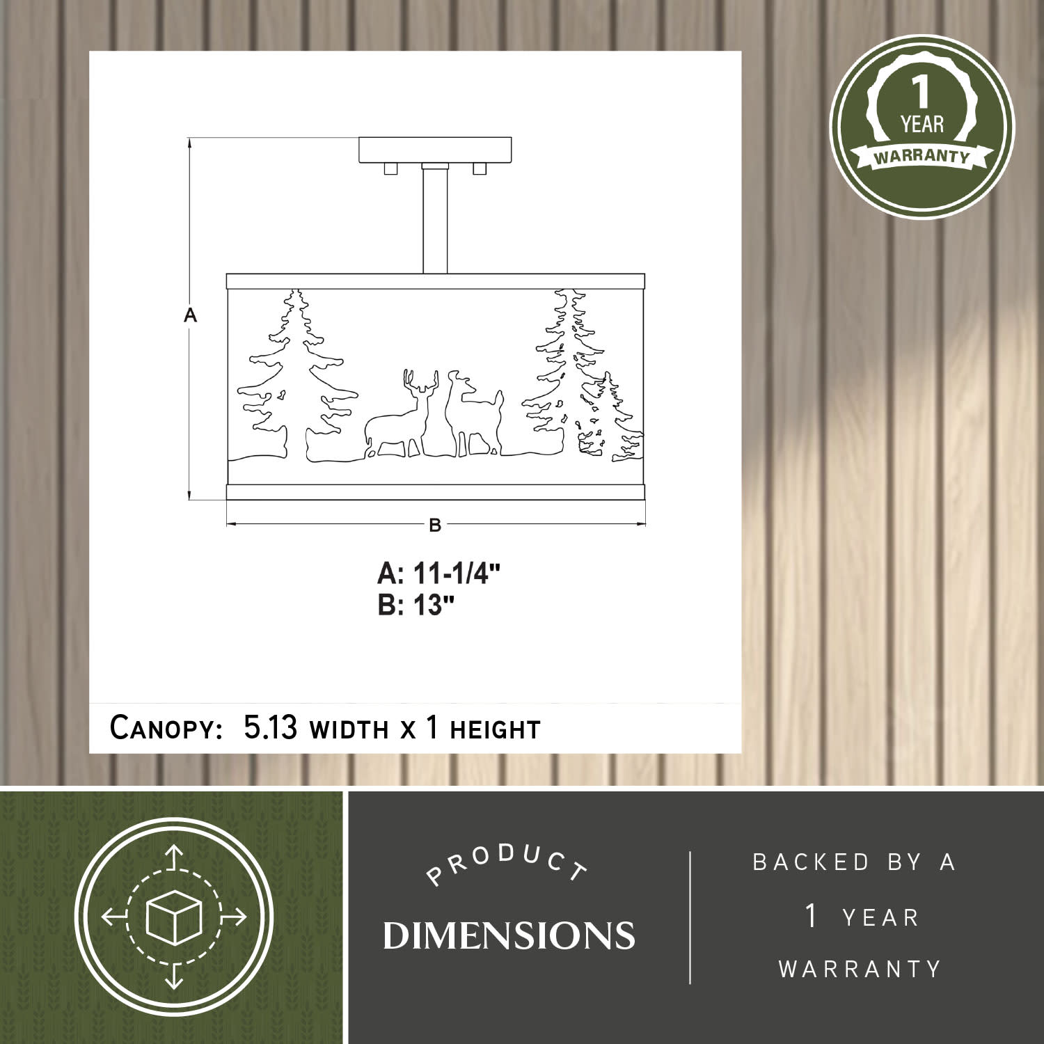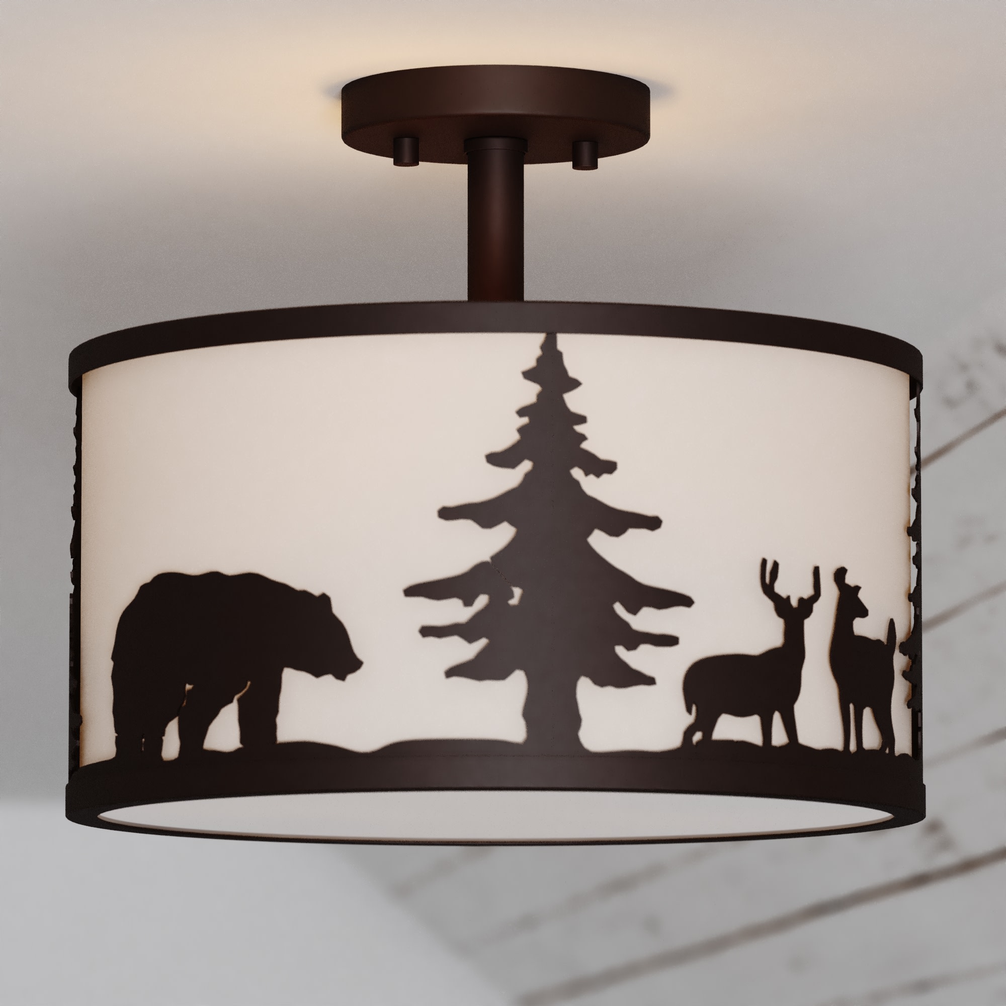 Item DescriptionEmbrace the serene whispers of the artfully crafted Acadia semi-flush ceiling light to bring the essence of the wild into your home. The Acadia's three lights and textured linen drum shade showcase bear and deer silhouettes set against a backdrop of evergreen trees. Perfect for kitchens or family rooms of cabins, lodges, or any home seeking to add a touch of nature and rustic ambiance.