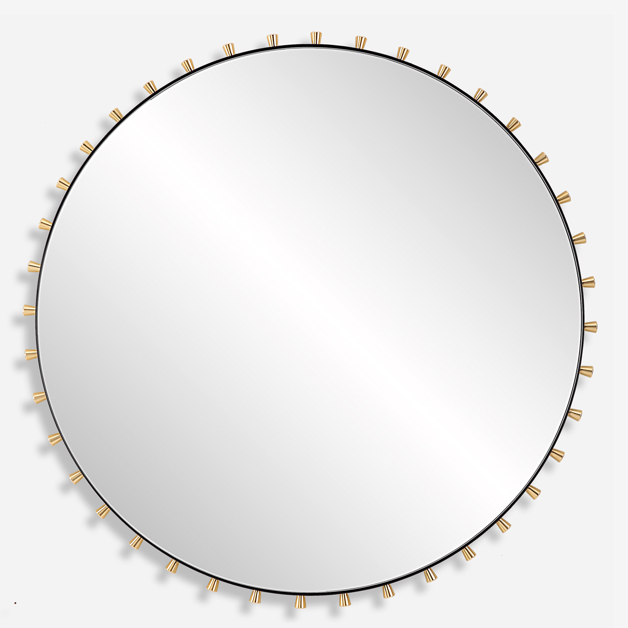 Item DescriptionThis modern round mirror features a iron frame finished, adorned with plated tapered round pegs surrounding a floating polished edged mirror.
