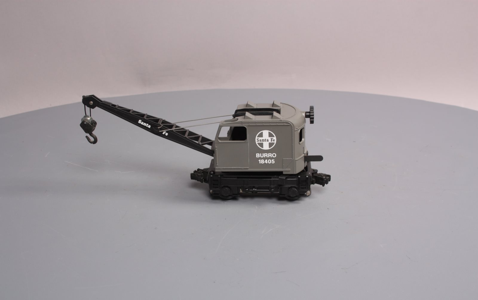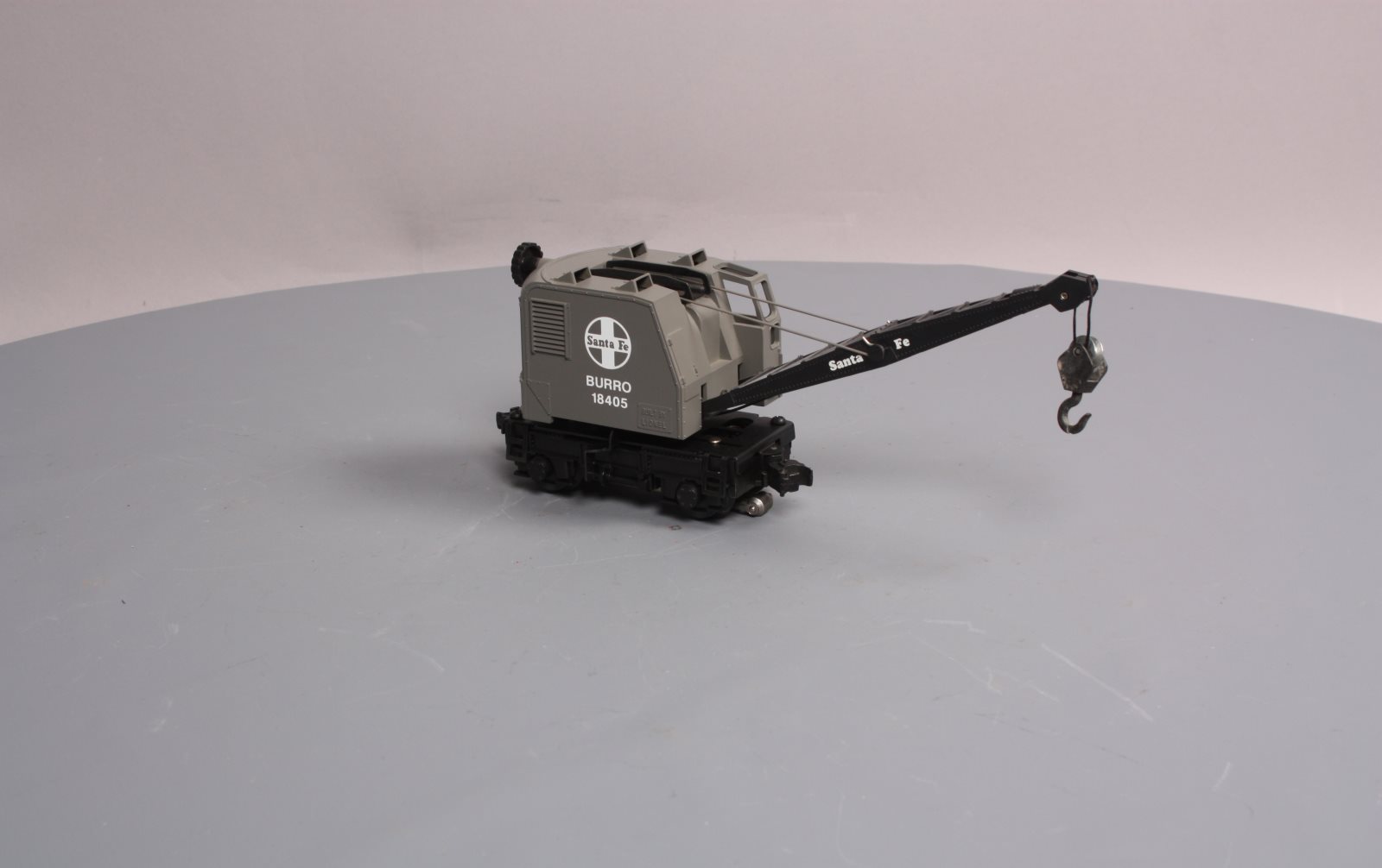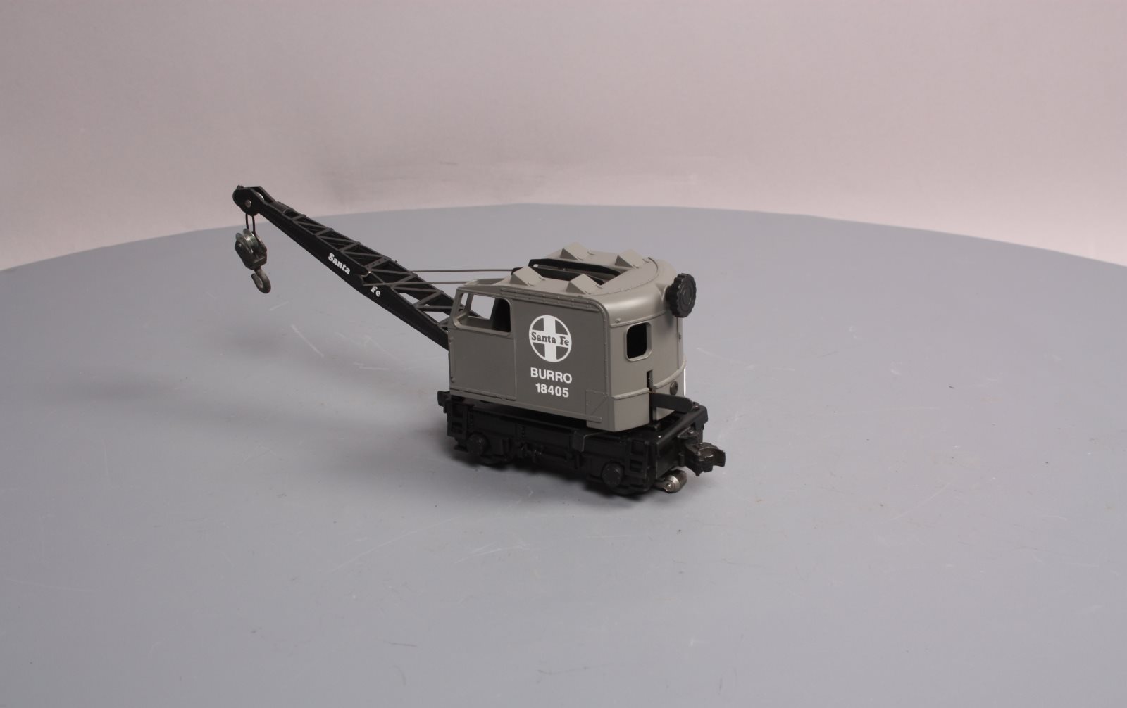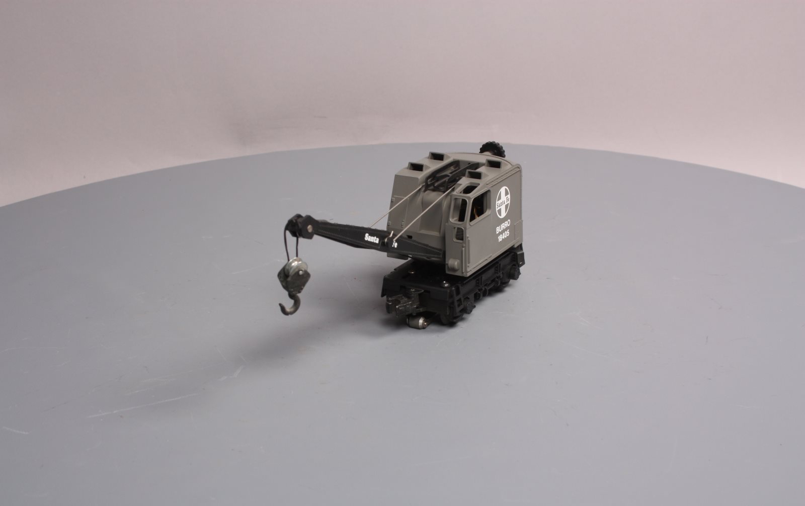 Here is a Lionel 6-18405 O Gauge Santa Fe Operating Burro Crane from 1989. This unique unit is self propelled and when activated by the special track clips the cab swivels and the hook raises and lowers. The boom can also be raised and lowered manually. It features a plastic body, a metal frame, operating knuckle couplers, and metal wheels. Minimum Curve: O-27