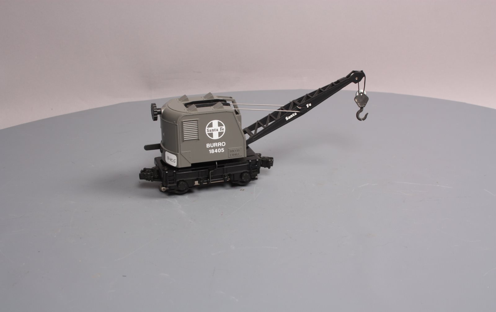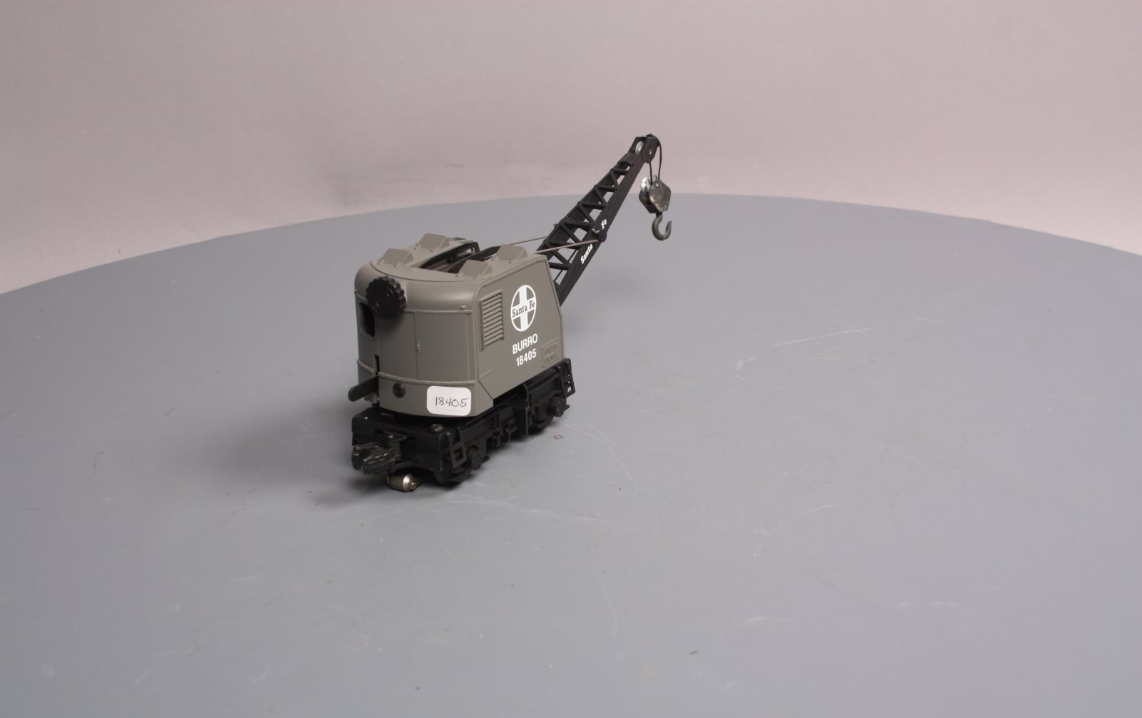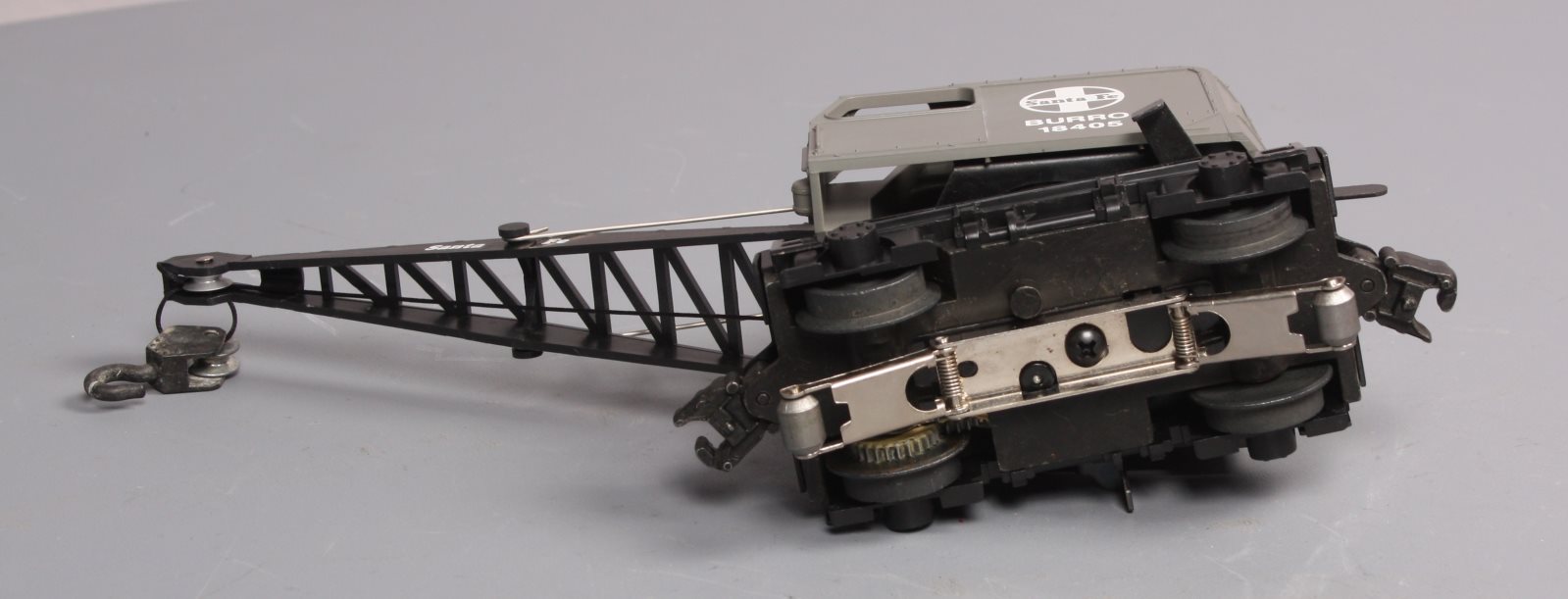 Here is a Lionel 6-18405 O Gauge Santa Fe Operating Burro Crane from 1989. This unique unit is self propelled and when activated by the special track clips the cab swivels and the hook raises and lowers. The boom can also be raised and lowered manually. It features a plastic body, a metal frame, operating knuckle couplers, and metal wheels. Minimum Curve: O-27