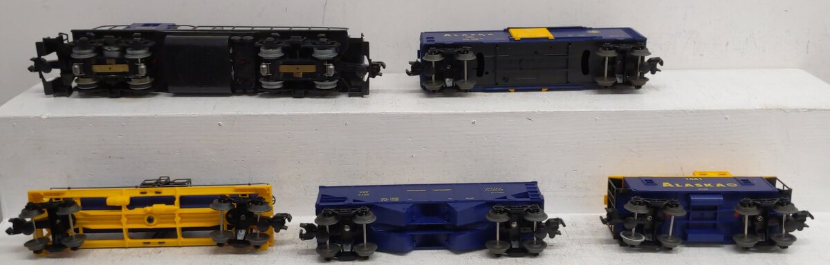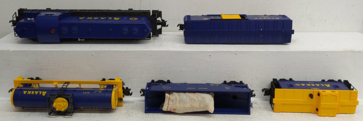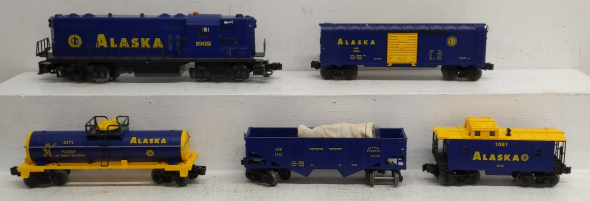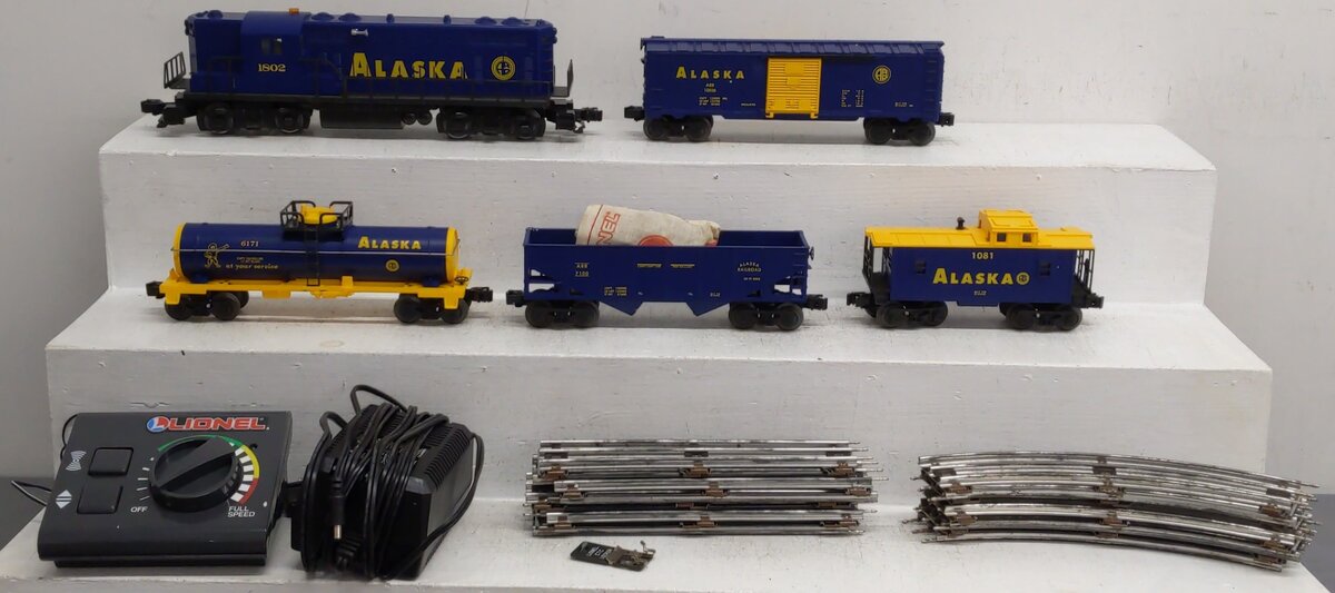 Here is a Lionel 6-11972 O Gauge Alaska Railroad GP-7 Diesel Train Set. includes: a 1802 GP-7 Diesel Locomotive, a Boxcar, a Tank Car, a Hopper, a Caboose, 40w, 3-AMP Power and Control System, 9 Pieces of Straight Track and 5 Pieces of Curved Track. The Alaska Railroad 1802 GP-7 Diesel Locomotive has the following features: a Single DC can motor, Transformer controlled, Stamped metal frame, Front and rear headlights (constant lighting), Diesel horn, and Metal hand rails. The Alaska Railroad Rolling Stock has the following features: Plastic frame and bodies, Plastic trucks, Plastic brake wheels and fuel tank, Plastic door guides on Boxcar, and the Boxcar has Opening doors. Set Length: 52 1/2". Layout Dimensions: 27" x 63" Oval. Minimum Radius: O27