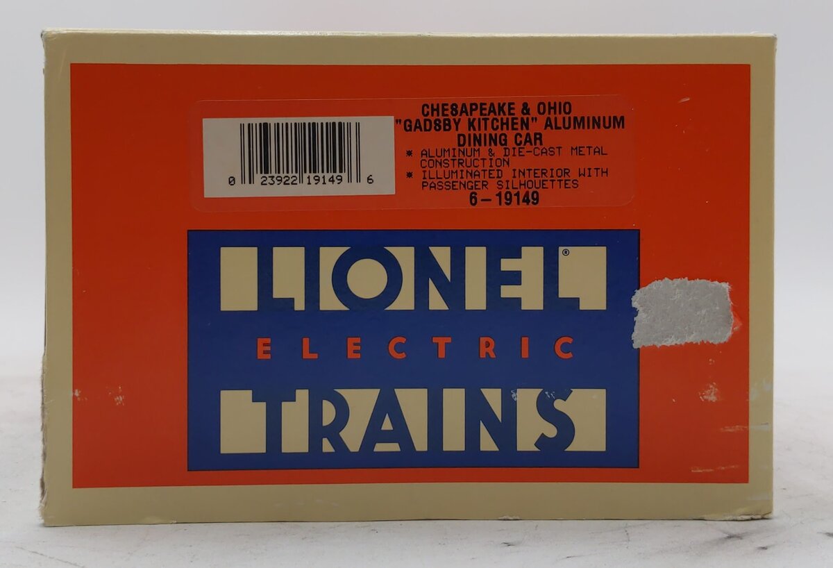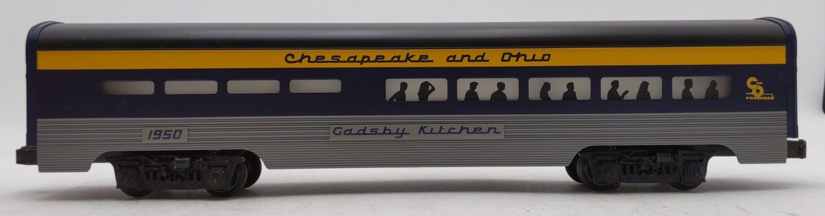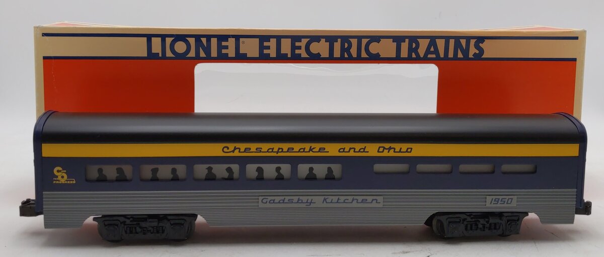 Here is a Lionel 6-19149 O Chesapeake & Ohio Aluminum "Gadsby Kitchen" Diner Car #1950 from 1996. It features die-cast trucks with operating couplers and an illuminated interior with passenger silhouetted windows and measures 15 inches long.