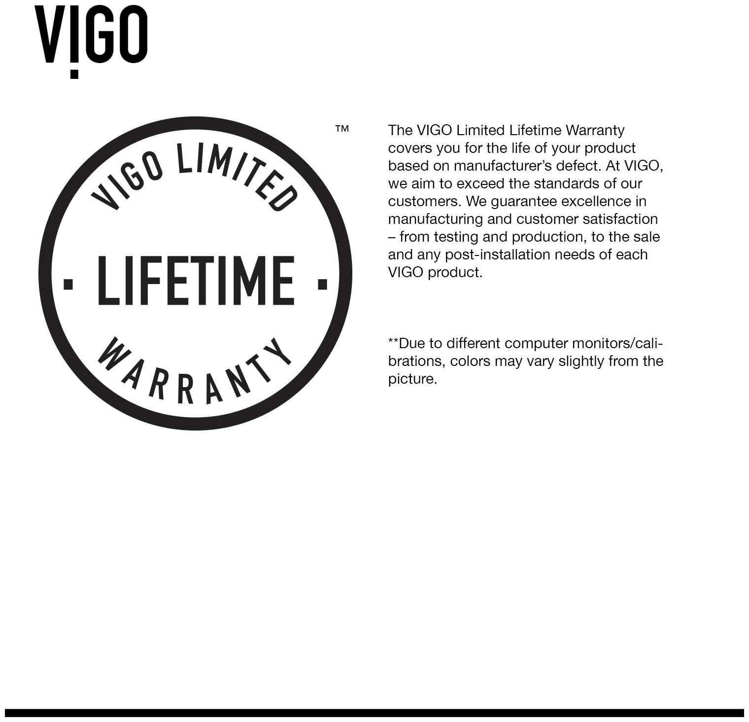 - Covered under Vigo's limited lifetime warranty and 1 year limited commercial warranty