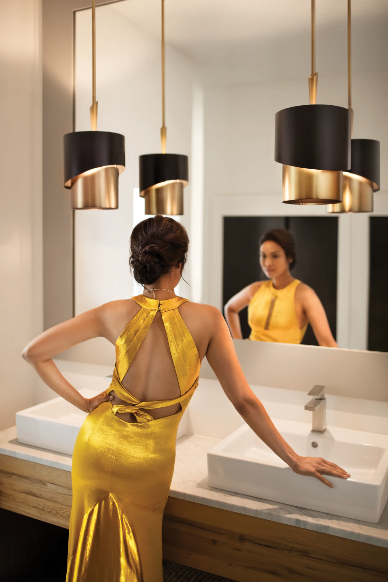Item DescriptionGigi's asymmetrical Gigi's silhouette creates a dramatic statement. The collection's sleek lines impart both glamour and sophistication while the stylish two-tone Heritage Brass and Satin Black finish combination delivers the ultimate in chic.