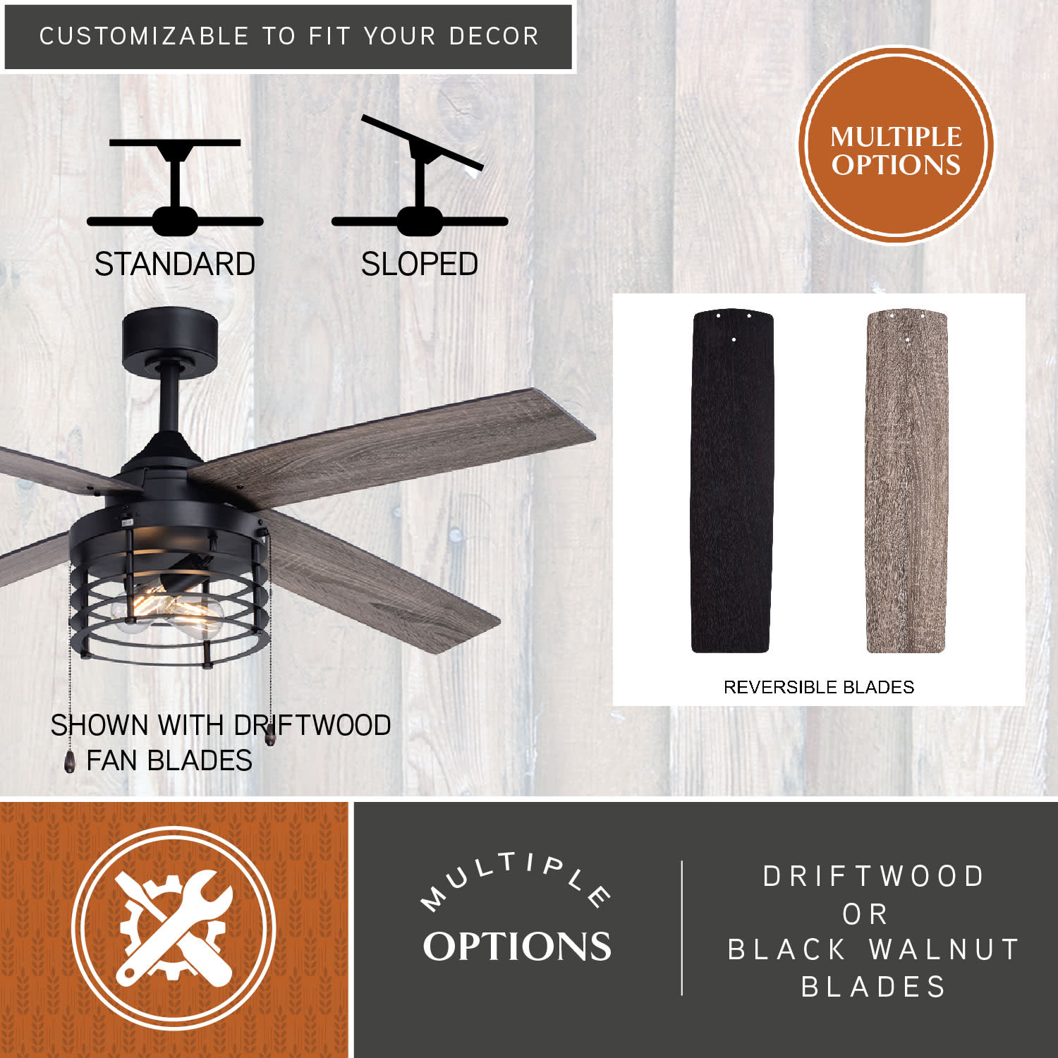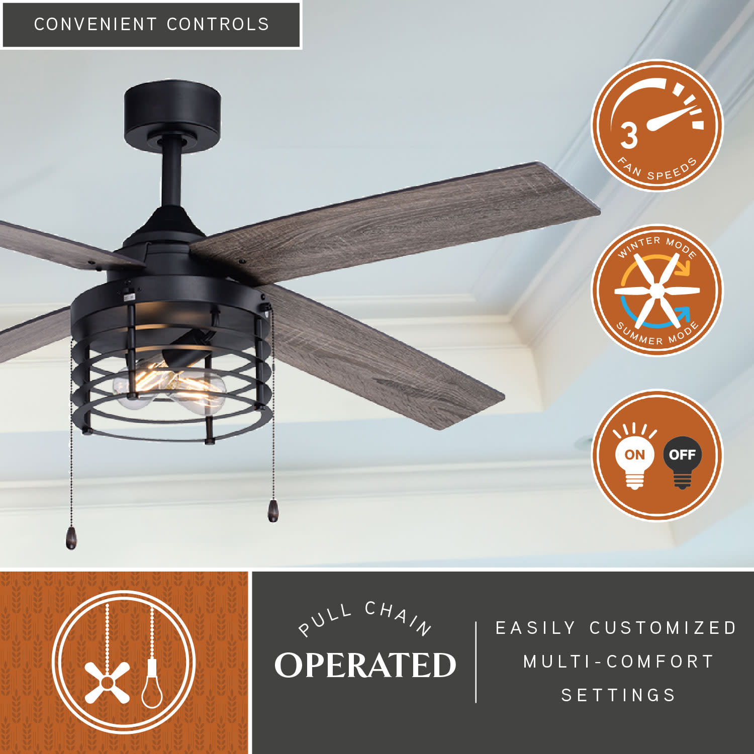 Item DescriptionIndustrial style is highlighted with the woven rod drum cage of the 52-in. Rowan ceiling fan. Four reversible blades offer a customized look which delivers comfort and warmth to your home’s family room, bedroom, dining room or kitchen. Perfect for adding an industrial edge to your transitional decor.