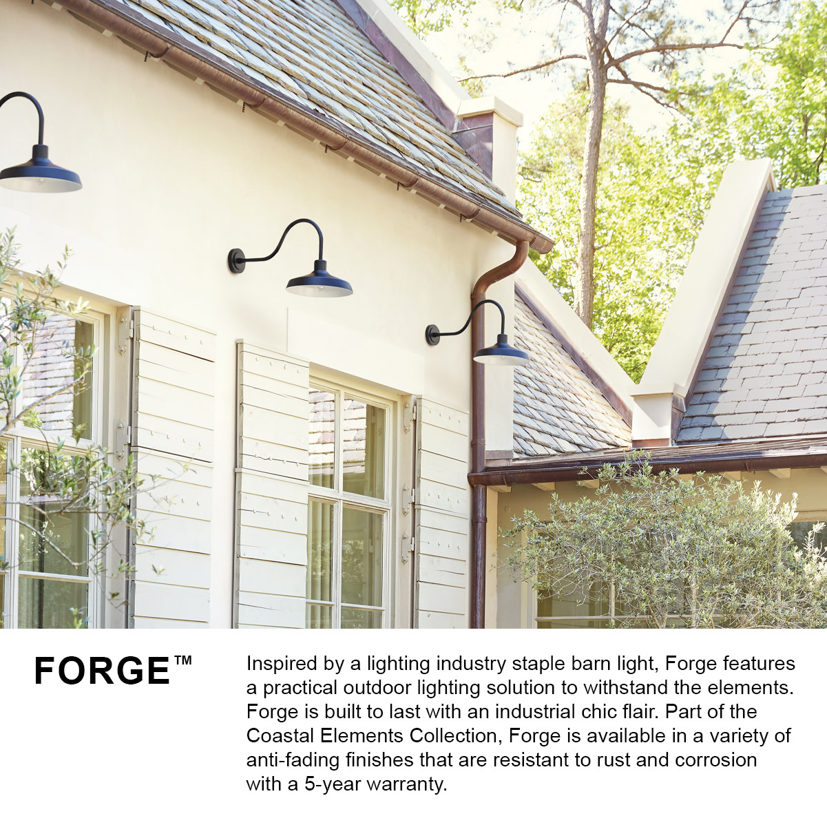 Inspired by a lighting industry staple barn light, Forge features a practical outdoor lighting solution to withstand the elements. Whether it is enduring harsh sunrays, extreme cold or continuous salt air, Forge is built to last with an industrial chic flair. Forge is available in a Black and Antique Brushed Aluminum finish resistant to rust and corrosion with a 5-year warranty.