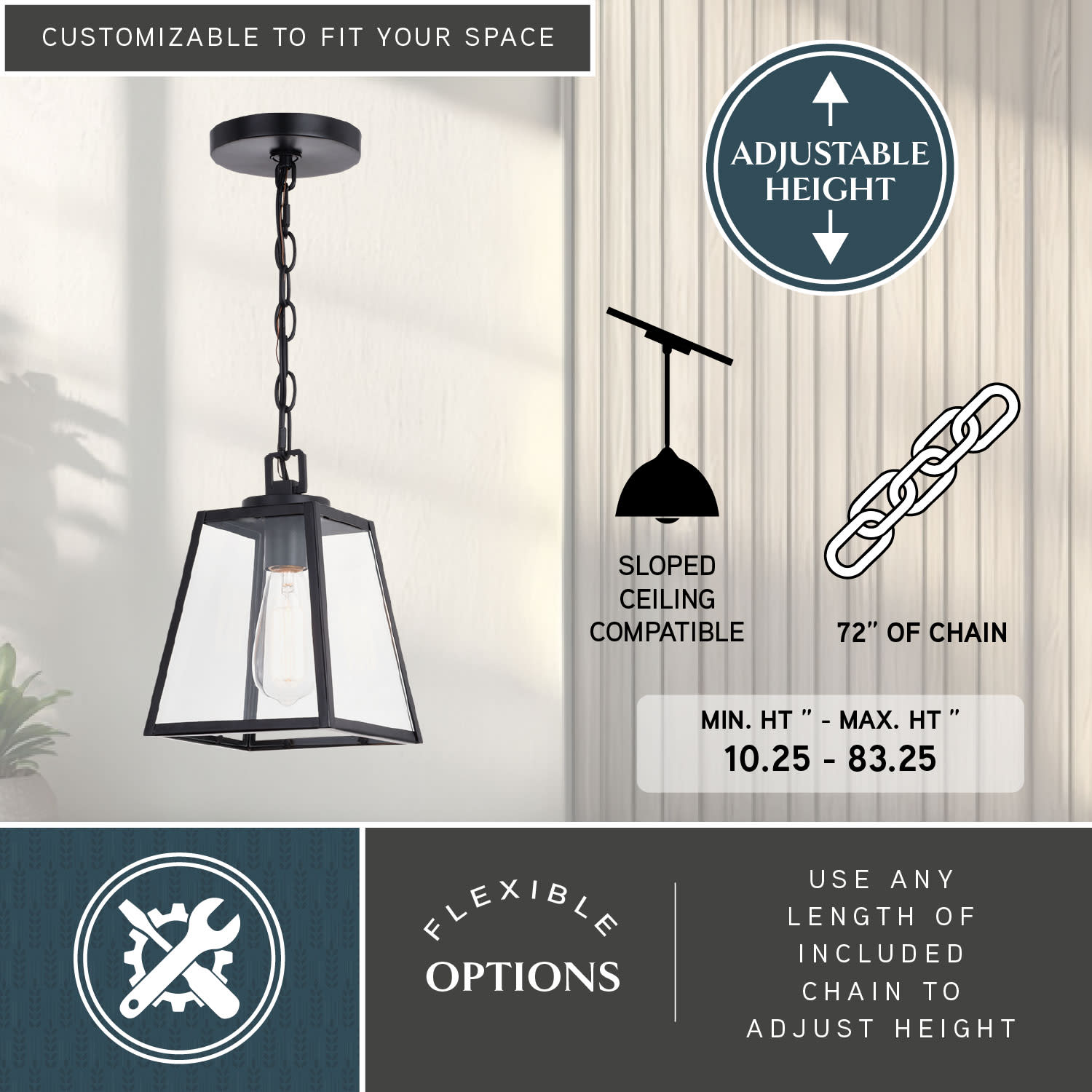 - Adjustable height; 10.25-83.25 inches using 72 inches of included chain