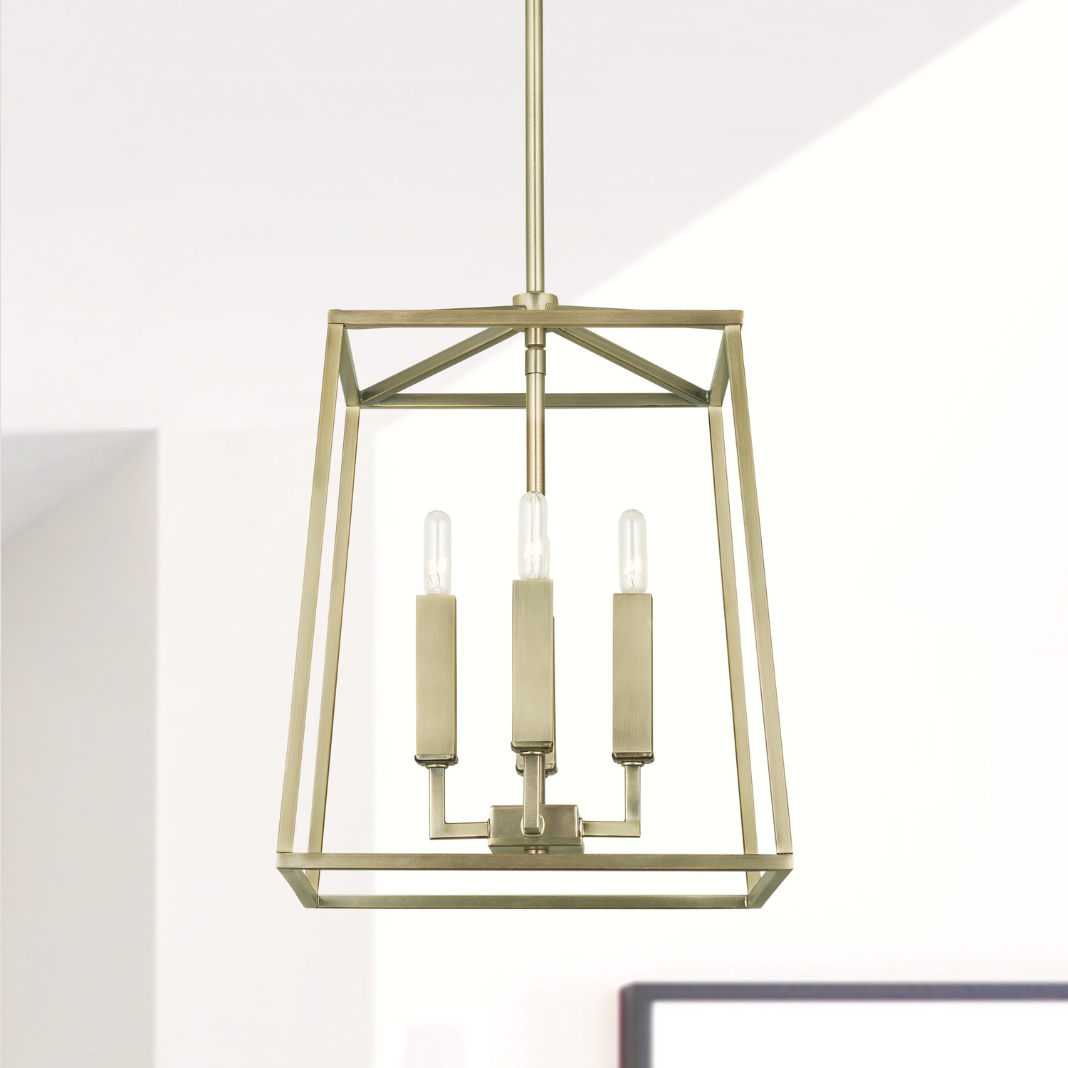 - Perfect for use in foyer entryways, dining room, kitchens, stairway. Squared candle covers enhance the striking aged brass finish in this entryway centerpiece.