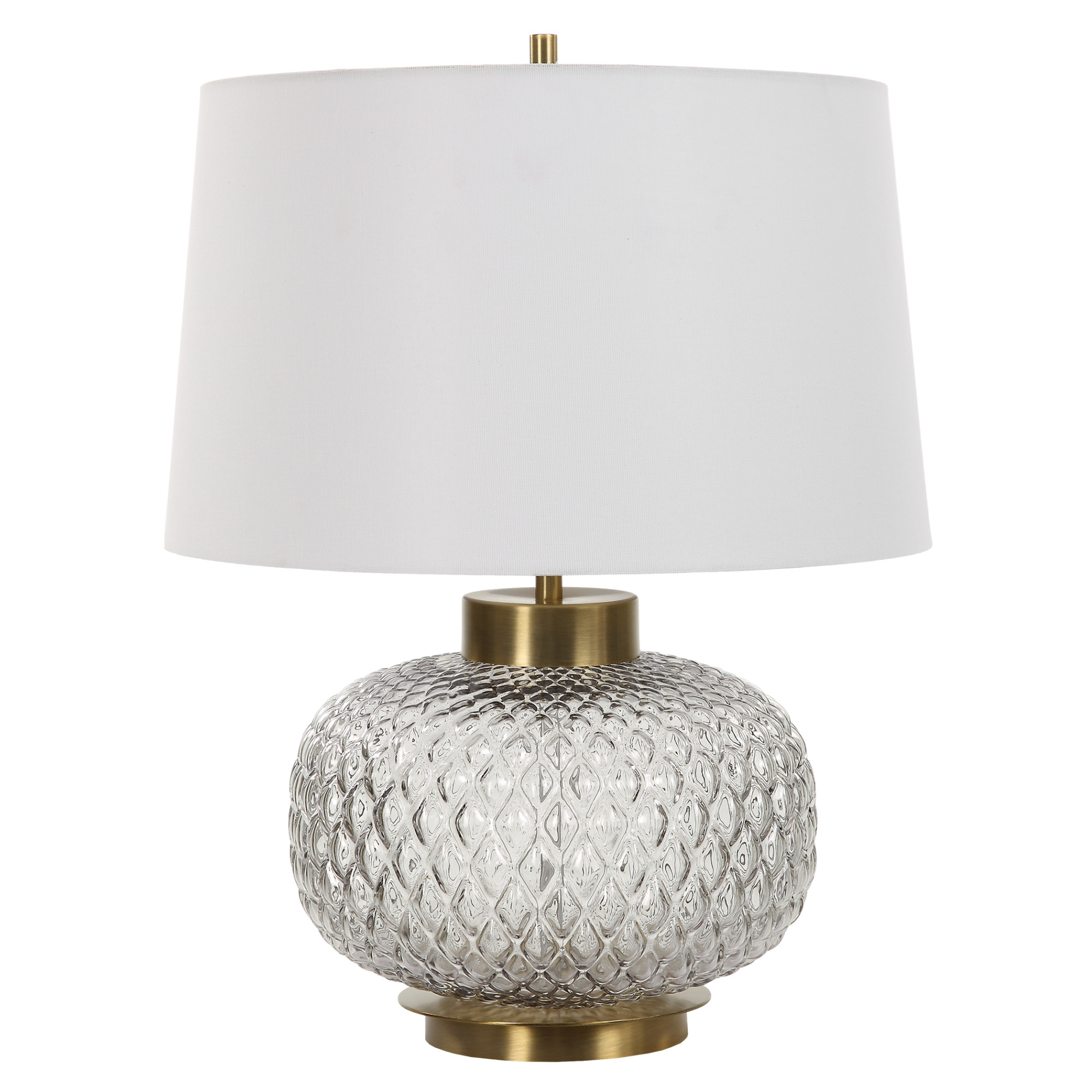 Item DescriptionThe Estelle table lamp features a heavily embossed, round lattice inspired, light smoke-gray glass base accented by a chunky antique brass foot and hardware. The slightly tapered round hardback shade is covered in a crisp white linen fabric.