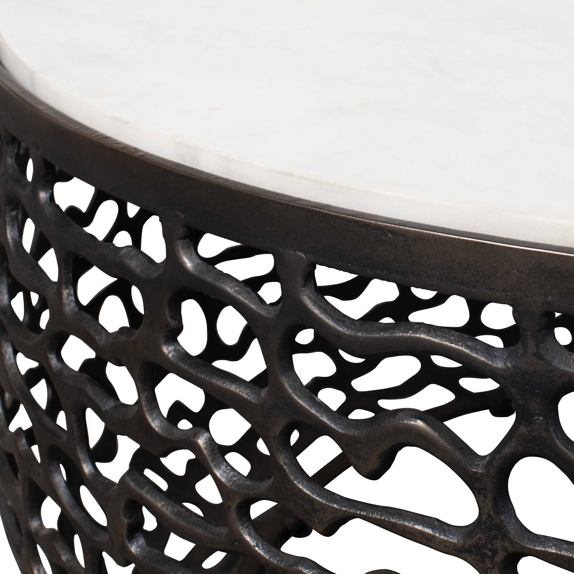 Item DescriptionThis striking coffee table boasts a marble top with subtle veining, creating a luxurious contrast with its intricately patterned cast aluminum base. Due to the nature of natural stone, every piece will vary slightly ensuring yours is unique. Suitable for both indoor and outdoor use.