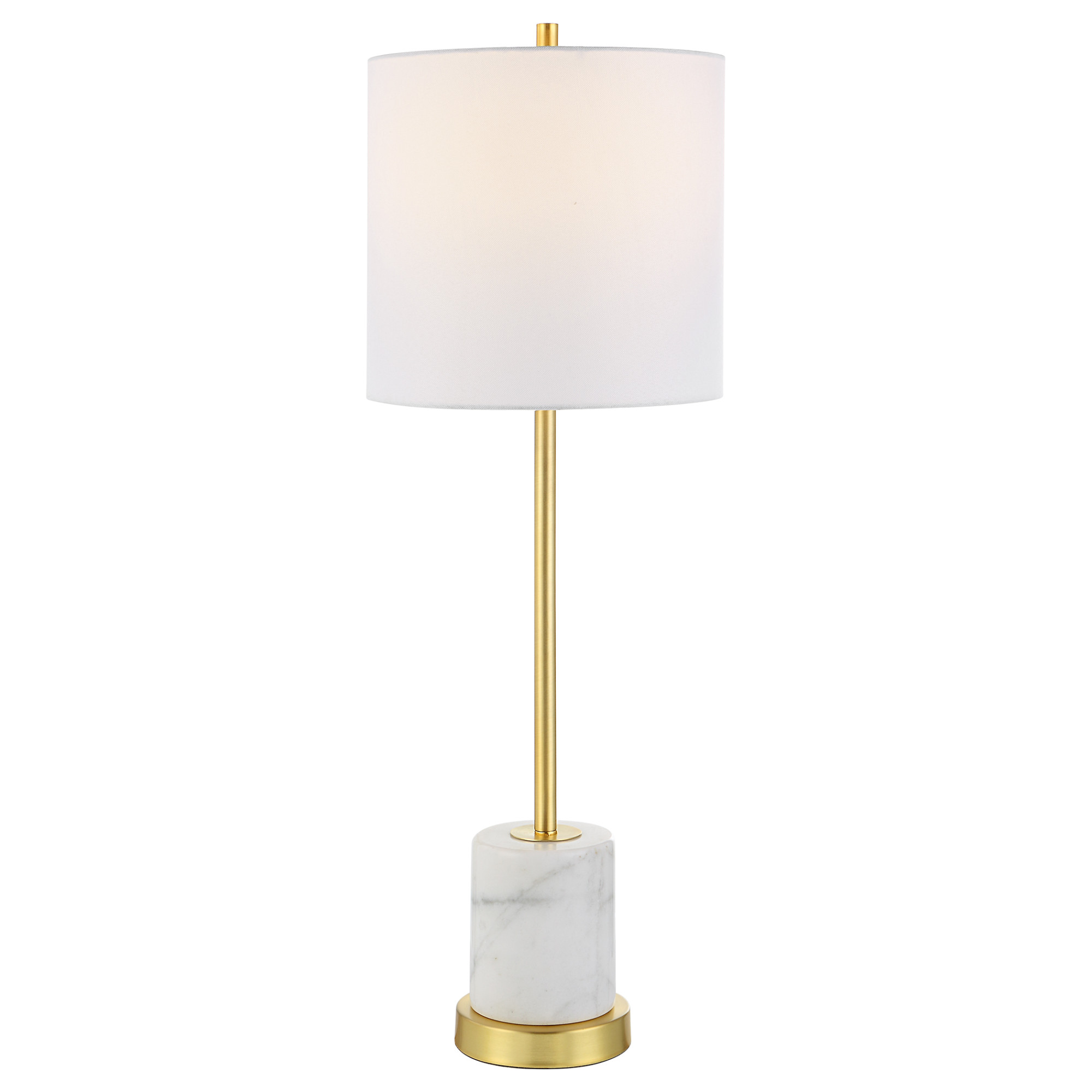 Item DescriptionStylish and versatile, this buffet lamp features a slim metal body in an elegant brushed gold finish paired with a substantial white marble foot. The round hardback shade is covered in a white linen fabric.