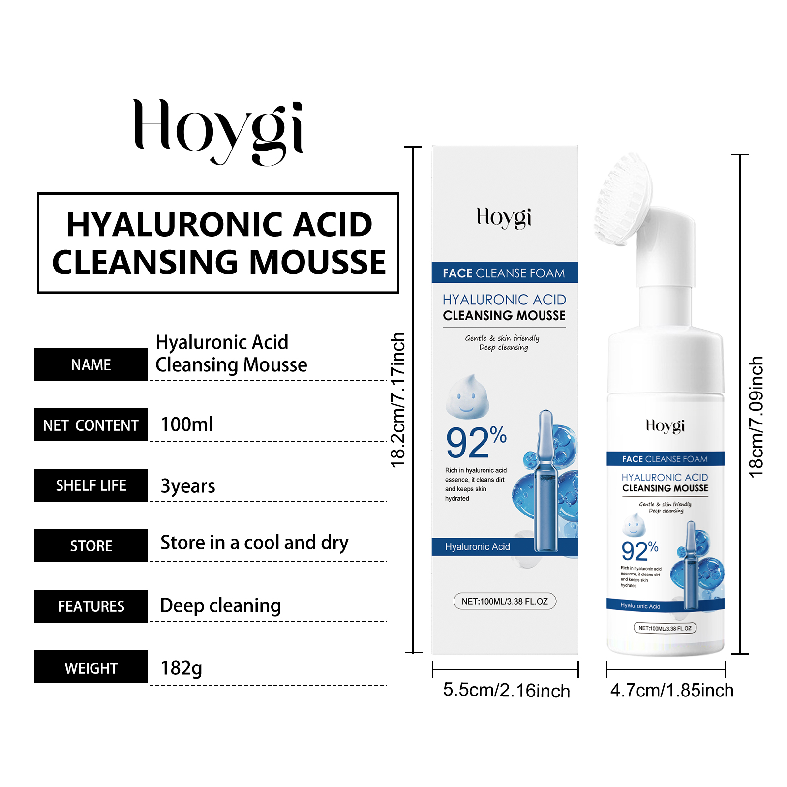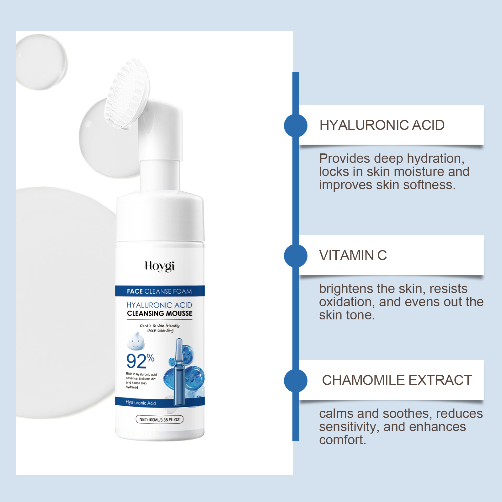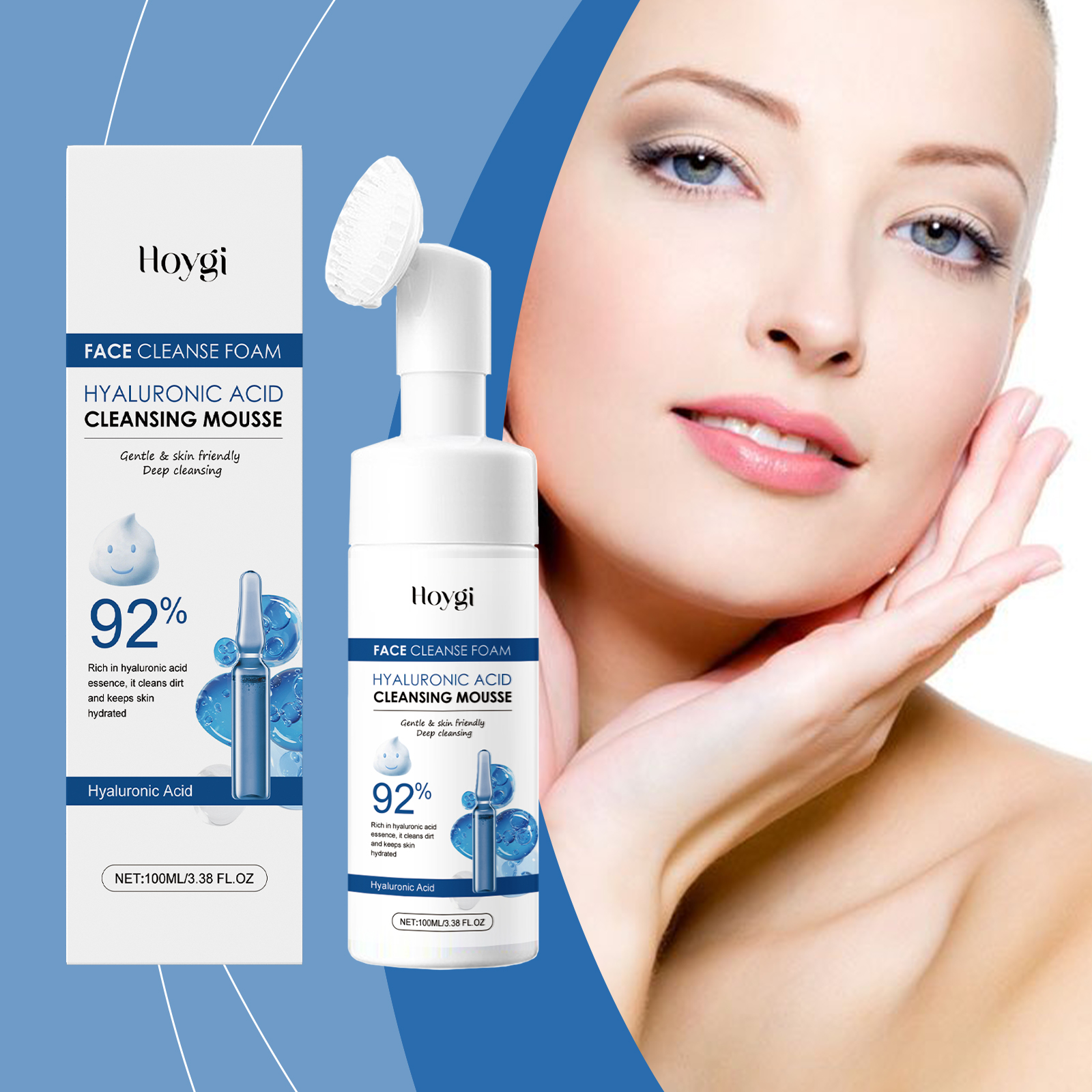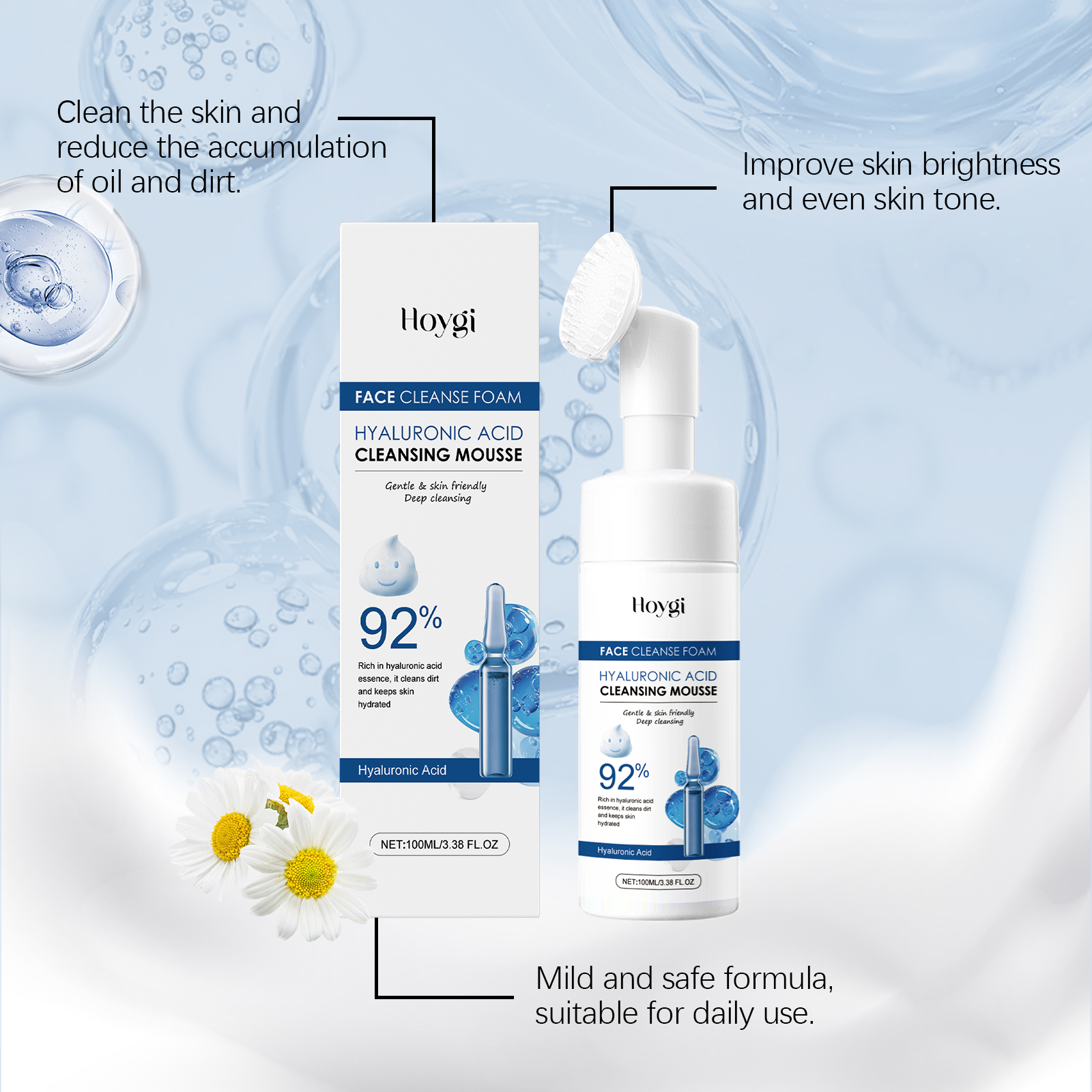 Our hyaluronic acid cleansing foam contains sodium cocoyl glycine and sodium lauryl amphoacetate. It gently soothes the skin and reduces irritation. The fine foam carries away the dirt and grease. Its application method is simple: 1. Clean and moisturize the facial skin; 2. Squeeze proper amount of cleansing mousse into palms, lather and massage into face. 3. Wash your face with clean water until it is clean. Deep cleansing of the skin removes dirt and excess oil to prevent clogged pores. Deeply nourish skin, anti-wrinkle, restore skin moisture and full, full of youthful vitality.