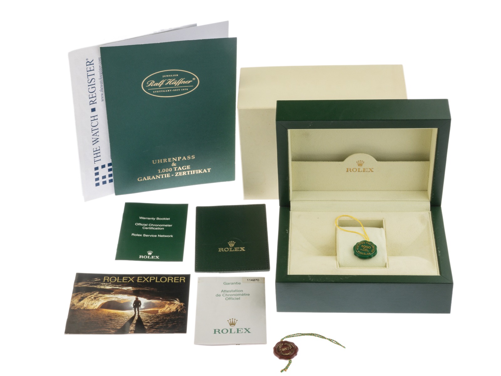Gehäuse Edelstahl poliert und satiniert, Gehäusedurchmesser ohne Krone 36mm, Gehäusehöhe 11,3mm. Lünette Edelstahl glatt und poliert. Armband Oyster Edelstahl poliert und satiniert, Sicherheitsfaltschließe Edelstahl mit Hersteller-Logo. Zifferblatt schwarz mit aufgesetzten weißgoldenen arabischen Ziffern und Indexen sowie weißgoldenen Zeigern. Uhrwerk Automatik, Chronometer mit Zeugnis, Rolex Manufakturkaliber 3130 mit 31 Edelsteinen. Anzeige von Stunde, Minute und Sekunde über Zeiger aus der Mitte mit Sekundenstopp zur sekundengenauen Einstellung der Uhrzeit. Saphirglas kratzfest. Krone verschraubbar mit Hersteller-Logo. Boden Edelstahl verschraubt. Gewicht der Uhr inklusive Armband 100g, Länge des Armbandes inklusive Gehäuse 170mm. Referenznummer: 114270, Gehäusenummer: Y996XXX, Baujahr: 2002, ID: P2581110000226H-9800, Artikelnummer: 10000084927. Mit Gangkontrolle und kompletter äußerlicher Aufarbeitung von Februar 2026. Original Rolex Box mit Umkarton und Garantie Papiere von Oktober 2003, LC 100 / Germany EU sowie Beschreibung, Ledermäppchen, Rolex Chronometer-Siegel und Watchregister Auszug von Februar 2026, The Watch Register Zertifikat / ohne Eintrag (Internationale Datenbank für verlorene oder gestohlene Uhren), Full Set. Superschnäppchen, Kapitalanlage mit Wertsteigerungspotential, aus erster Hand. Sehr guter Zustand. Lieferzeit sofort.