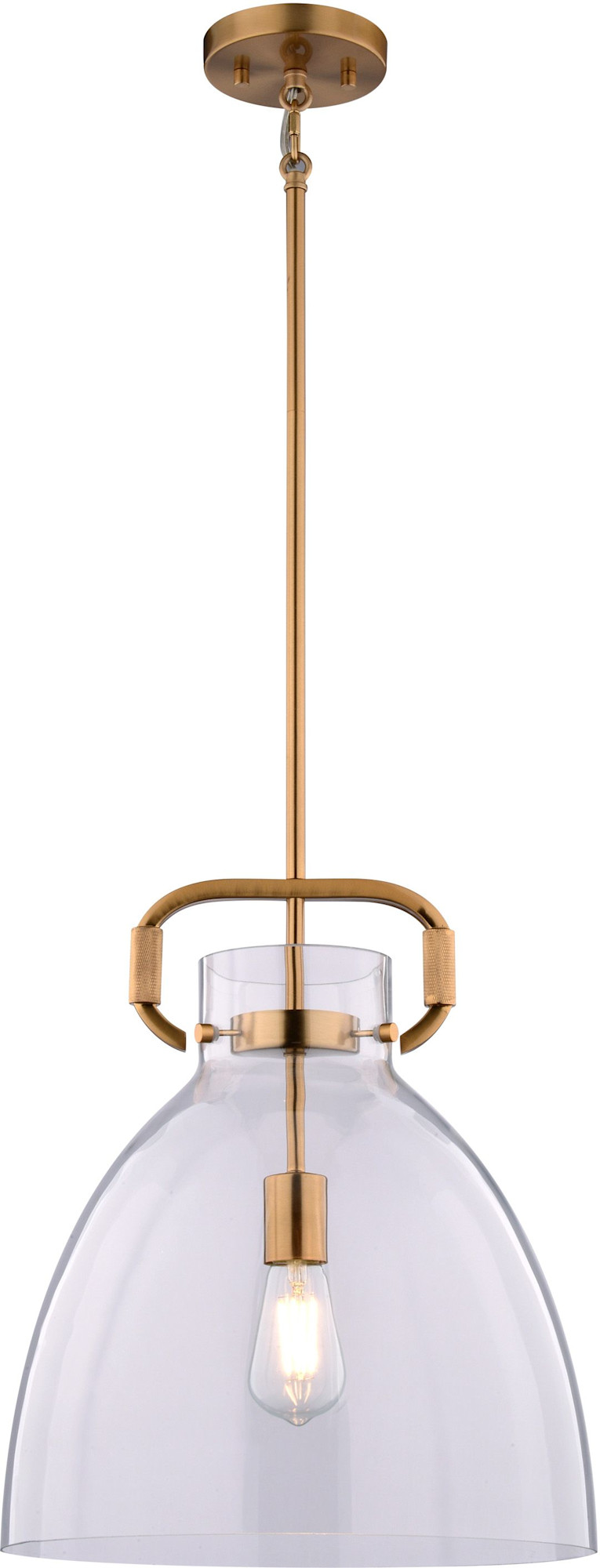 Item DescriptionAdd a touch of modern industrial style to your kitchen island or dining nook with the Madrona pendant. Its clear glass bell-shaped shade and industrial ring top with knurled metal accents create a unique and eye-catching statement. The muted finish adds warmth and sophistication, elevating your home's style without breaking the bank.