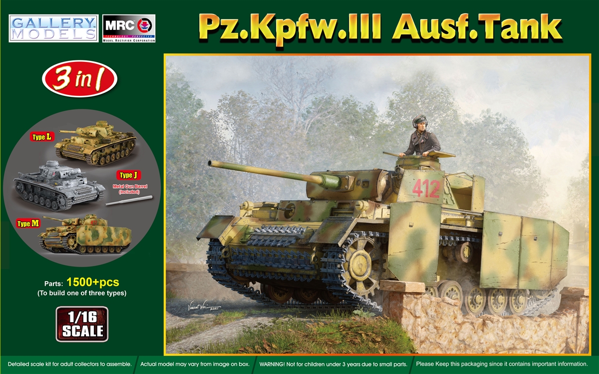 This is a Gallery Models 64011 1:16 Pz.Kpfw.III Ausf. Type J/L/M Tank Plastic Model Kit. Build in one of three versions: J, L, or M. Includes Copper cable, Metal Gun Barrel, Photo Etched Parts, With armor skirts, 102 paired tracks, Over 1500 parts, and 2 upper hulls. Decal sheet with multiple options including TYPE M: Pz. Rgt. 3,2 Pz. Div. Kursk 1943, 3. Pz.Gren.Div. Totenkopf, Kursk 1943, 6. Pz.Div. Kursk 1943, TYPE J: 3. Pz. Rgt.7, 10. Pz. Div. Tunisia 1943, 2. Pz. Div. Russia 1941, TYPE L.