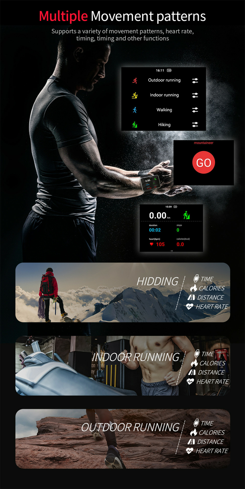 Sports Watch: Built-in motion sensor to monitor your exercise status in real time, supports multiple sports, accurately records all-day activities like active time, steps, distance, calories burned and heart rate.