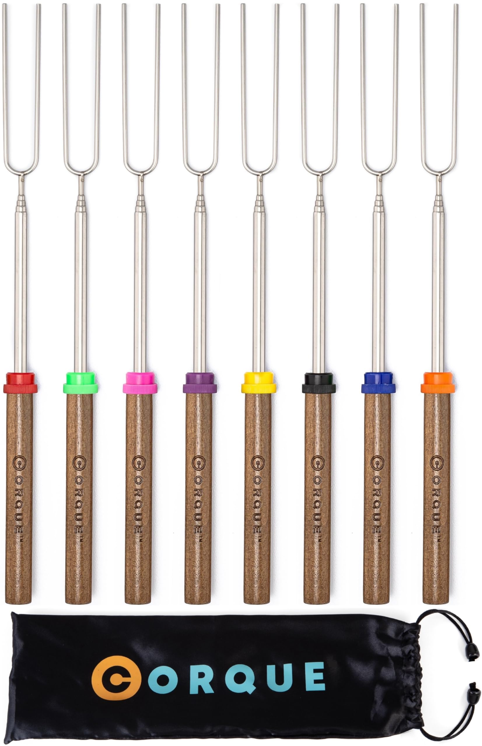 Compact Design Hot Dog Roasting Stick for Fire Pit: The 32-inch extendable smores skewers for marshmallow convenient design gives optimum control for roasting sausages, wieners, hot dogs and vegetables. This marshmellow sticks camping smore kit for fire pit has extendable roasting sticks for campfire which are easy to hold and cook food. CORQUE telescoping marshmallow sticks are easy to carry and best for backyard, outdoors, and serve as a handy fork for camping needs.