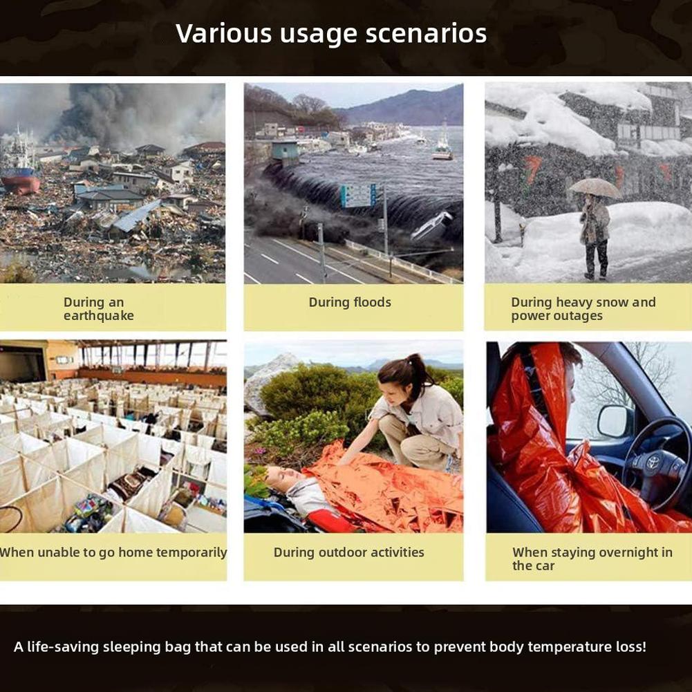 Multifunctional survival gear: In addition to being a sleeping bag, it can also be used as a large blanket, poncho, tent footprint, wind proof, and even to collect water or melt snow. Its versatility makes it a valuable tool for outdoor survival and disaster preparedness.
