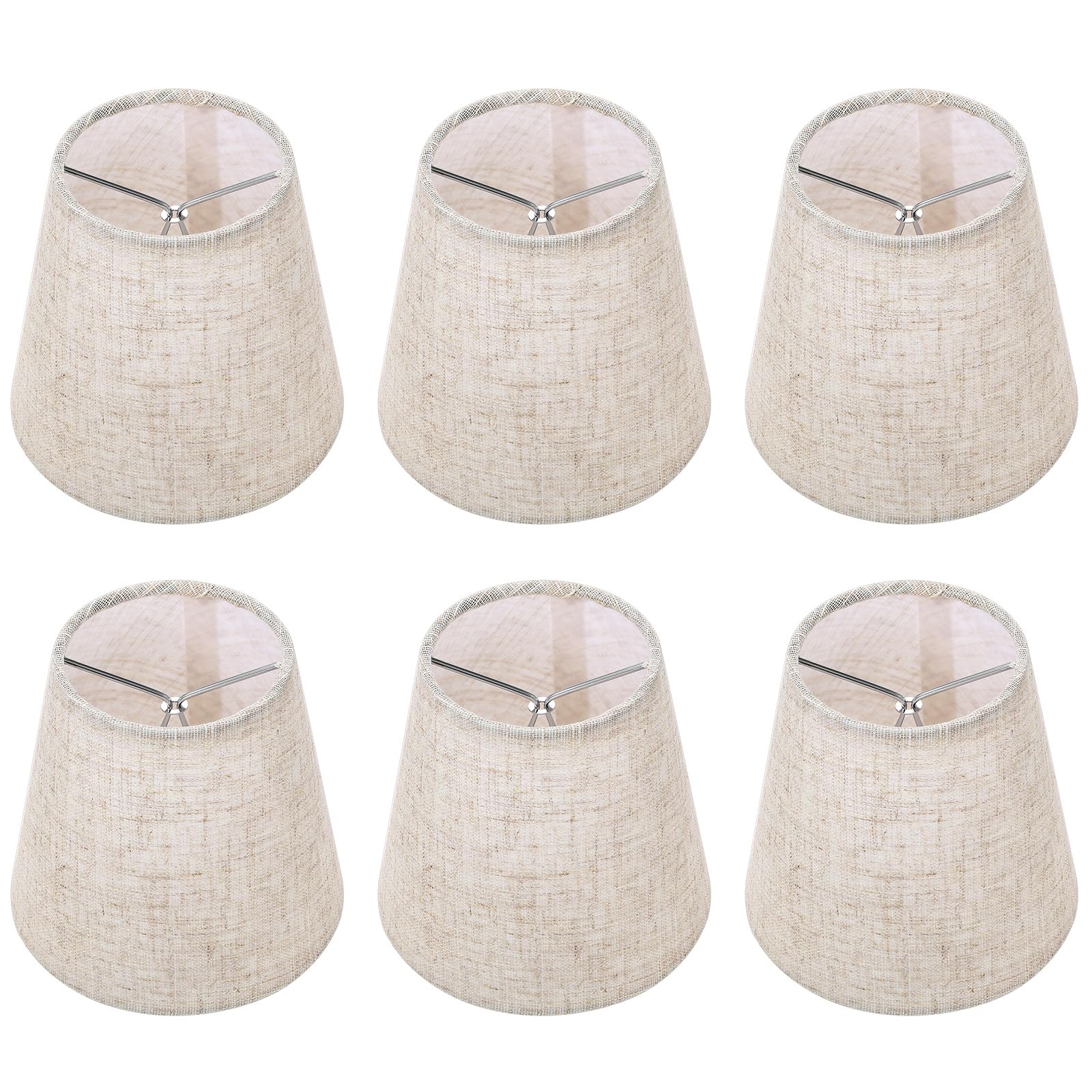 Title: Complete 6-Pack of Premium Clip-On Lamp Shades for E12 Bulbs Overview: Upgrade your home's lighting with our versatile 6-pack of lamp shades. Combining a classic design with premium materials and effortless installation, this set offers everything you need to refresh multiple rooms with warm, inviting light. Key Features: ✅ Perfect Fit, Guaranteed: Each shade features a classic design measuring 5.5" (Bottom) x 3.5" (Top) x 5.1" (Height). For a perfect match, we highly recommend verifying these dimensions against your lamp base or harp before ordering. ✅ Effortless E12 Clip-On Installation: Designed specifically for candelabra (E12) base bulbs, these shades feature a simple clip-on mechanism. No tools or technical skills are needed—just snap them onto your chandelier, wall sconce, or table lamp in seconds. ✅ Premium & Safe Construction: Crafted for durability and peace of mind. Each shade is made of high-quality linen fabric, a sturdy metal frame, and a built-in flame-retardant PVC lining. This robust combination ensures long-lasting use while effectively resisting fading, warping, and deformation. ✅ Versatile Ambiance for Any Room: Perfect for creating a warm and cozy atmosphere in your living room, bedroom, or dining area. The shades soften harsh light, reduce glare for enhanced visual comfort, and are compatible with a wide range of fixtures to effortlessly elevate your entire home's ambiance.