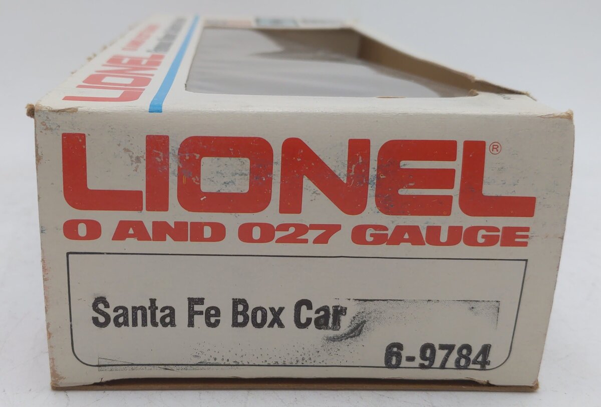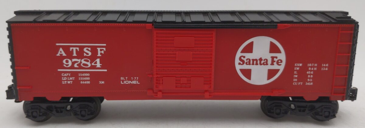 Here is a Lionel 6-9784 O Gauge Santa Fe Box Car from 1977. This car features sliding doors, plastic trucks, operating knuckle couplers, and metal wheels and axles.