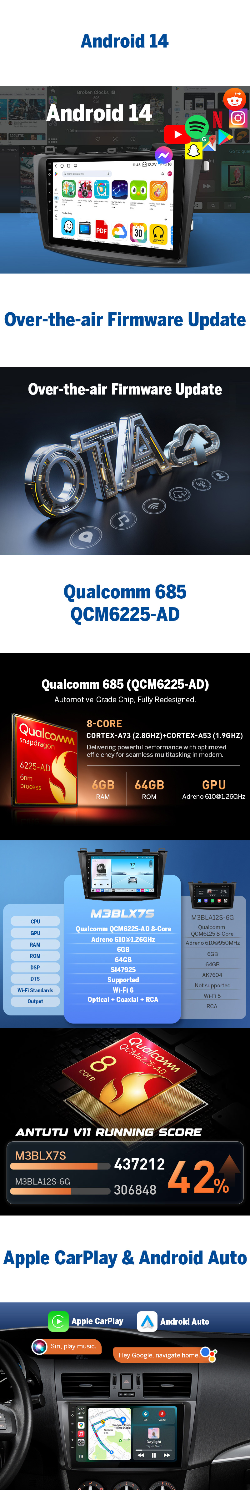 DSP Digital Amplifier A303 – recommended for audiophile upgrades ❓ FAQ 🔹 Will it fit my Mazda 3? Yes. Built specifically for Mazda 3 (2010–2013). Keeps Bose, steering wheel buttons & factory LCD working. 🔹 Is CarPlay & Android Auto wireless? Yes — supports both wireless & wired with fast auto-connect. 🔹 Do I need a SIM card? Only if you want built-in 4G internet. CarPlay, Android Auto, GPS, Bluetooth, USB & radio work without a SIM. 🔹 Does GPS work offline? Yes. Built-in GPS supports offline maps. 🔹 Does Netflix work? No. Netflix and DRM apps are blocked on all Android car stereos due to licensing. YouTube & local video work perfectly. 🔹 How is the sound quality? Top-tier. 48-band DSP, time alignment, digital outputs and powerful amplifier deliver true hi-fi audio. 🔹 Does it overheat? No. Qualcomm 6-nm CPU + active cooling = stable even in hot climates. 🔹 Can I add cameras & accessories? Yes — supports backup camera, dash cam, DAB+, OBD2 & more. 🛡 Buy With Total Confidence ✔ Vehicle-specific factory fit ✔ Zero-risk plug-and-play installation ✔ Keeps original car functions ✔ Premium hardware & long-term OTA support ✔ Trusted by Mazda owners worldwide ✔ Satisfaction guarantee Upgrade your Mazda 3 the right way — Faster, smarter, clearer, and safer than factory. 🚗✨ ⭐ Vehicle Compatibility Designed for 2010 Mazda 3, 2011 Mazda 3, 2012 Mazda 3, 2013 Mazda 3. Plug & play. ⭐ Specification - Operation system: Android 14