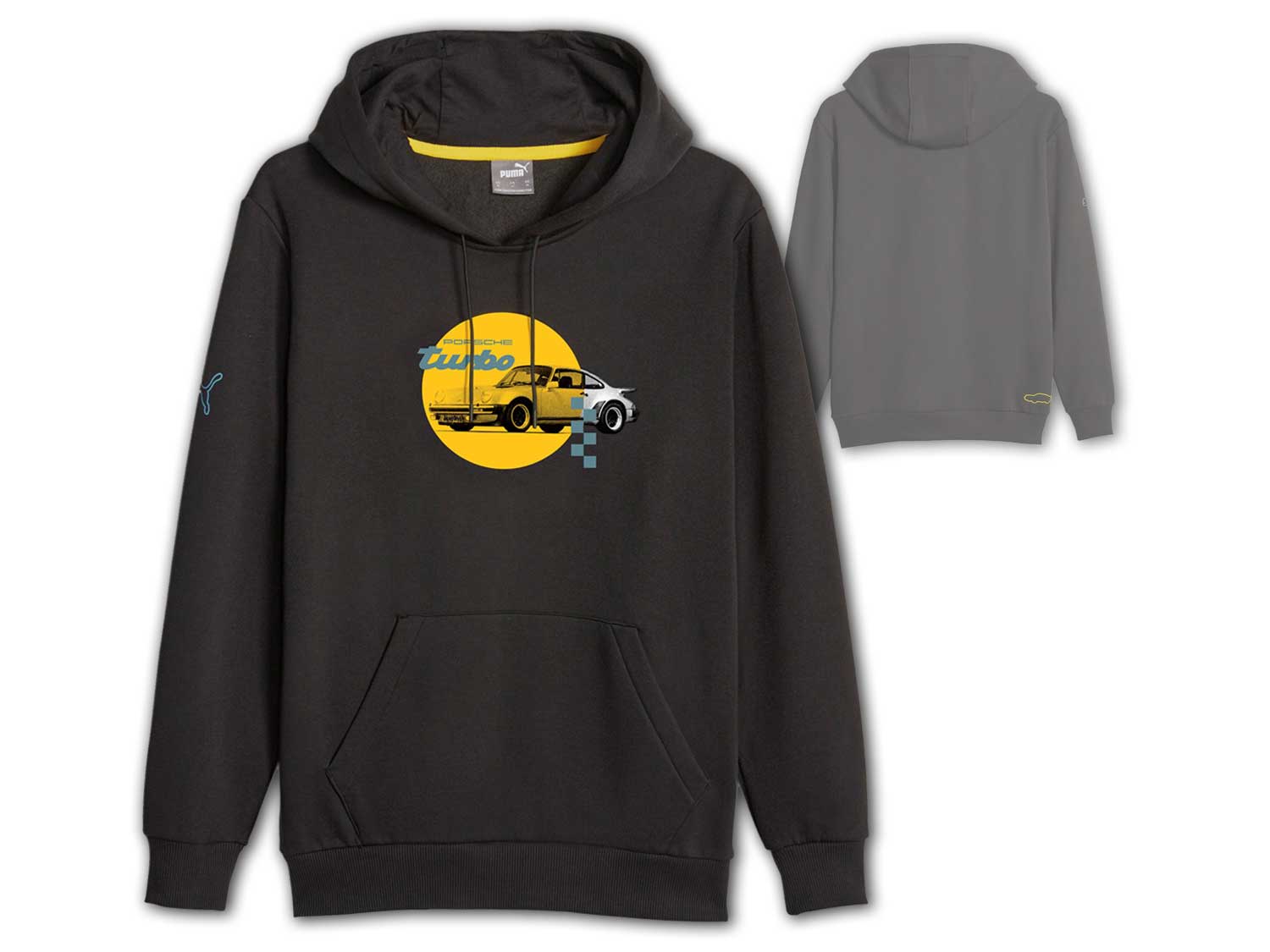 Hochwertiges Porsche Kapuzensweatshirt in schwarz für Freizeit, Lifestyle und Sport von Puma. Stylisches Porsche Turbo Hoody aus der Motorsportkollektion des deutschen Automobilherstellers, welches sehr leicht und hochwertig verarbeitet wurde und ein must have für einen jeden Motorsport Fan. Der Hoodie ist innen angerauht und zeichnet sich durch angenehmen Tragekomfort aus und verfügt über Ärmel mit Bündchen und einer Känguru Eingrifftasche vorne. Material: 68% Baumwolle, 32% Polyester; Farbe: PUMA BLACK.