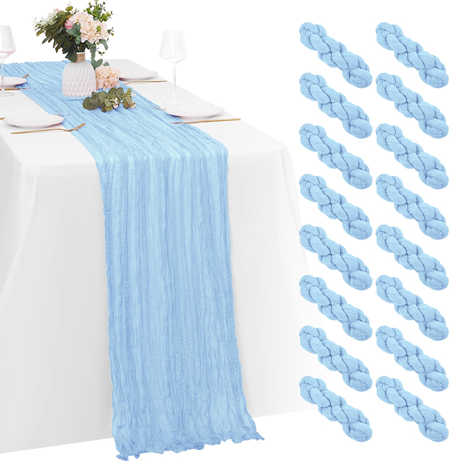 Baby Blue Cheesecloth Table Runners Product Information Package includes: 16 packs cheesecloth table runners Color: Baby Blue Material: High Quality Polyester Fiber Boho Rustic table runner dimensions: 20 inches*120 inches Cheese Cloth Table Runner Features: 1. Our Boho Gauze Cheese Cloth Table Runner is made of 100% high-quality gauze. The gauze table runner has beautiful pleats, exquisite craftsmanship, neat lines, and beautiful appearance. 2.Our cheesecloth table runner is very elegant. Even if placed randomly on the table, it will bring a lazy decorative aesthetic, saving you energy and patience. adding a romantic atmosphere to your wedding or special event, elegant and dreamy. 3.If it is dirty after use, you can hand wash it with a mild detergent in cold water. Please use a laundry bag if machine washing, lay flat or hang to dry. Widely Use: perfect for weddings, parties, baby showers, woodland baby showers, hunting baby showers, arch curtains, Easter, Christmas, birthdays or any other event you want to celebrate, adding a romantic touch and creating a warm party atmosphere. Tips: 1. Don’t bleach and twist it, and please don’t dry it in direct sunshine, or it maybe will fade. 2. There may be slight errors in size due to manual measurement. 3. Our table runners are all taken in kind, and the pictures have been color corrected and adjusted. However, please allow slight color differences due to different screens and light. Everything is subject to the actual product. Please forgive me. Excellent service: We always put customers' needs first and provide customers with high-quality products and good services. If you have any questions, please feel free to us and we will provide you with answers 24 hours a day. Whether it is consultation before purchasing, or any dissatisfaction caused by any reason after receiving the product, we will definitely solve it for you until you are satisfied.