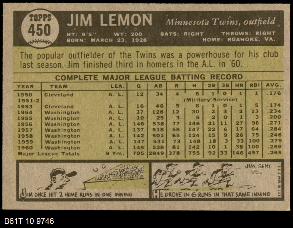 | 1961 Topps #450 Jim Lemon | 6 - EX/MT | Front | Back |
