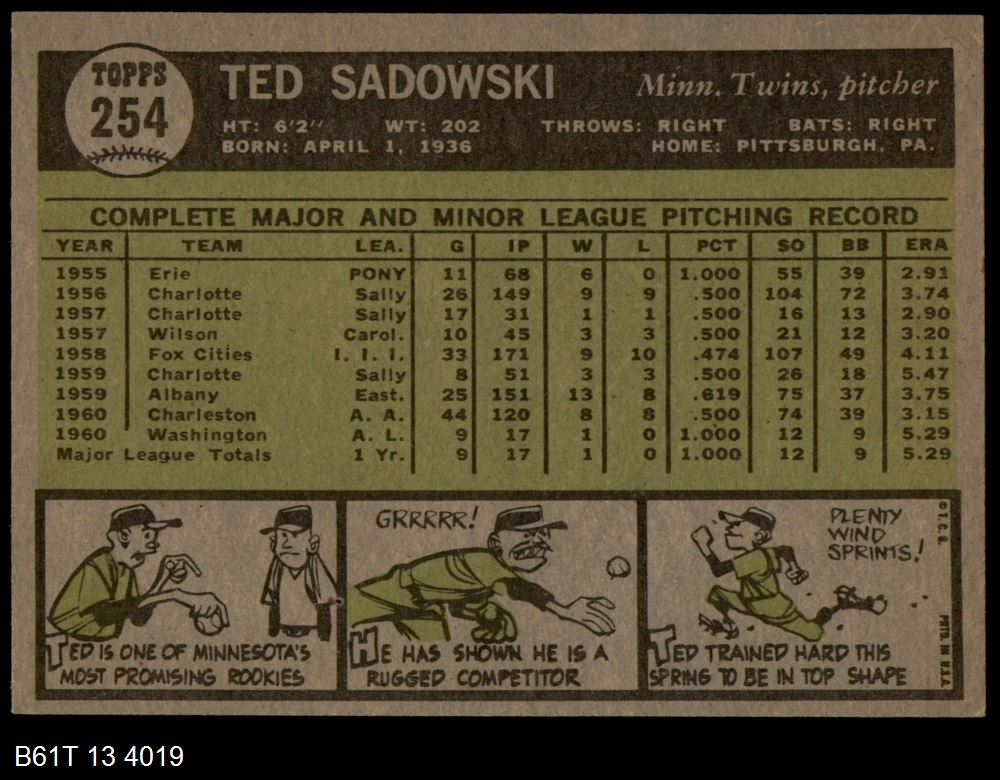 | 1961 Topps #254 Ted Sadowski | 6 - EX/MT | Front | Back |