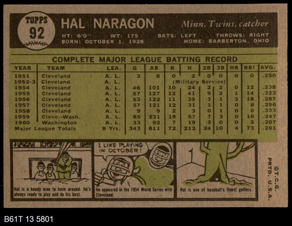 | 1961 Topps #92 Hal Naragon | 5 - EX | Front | Back |