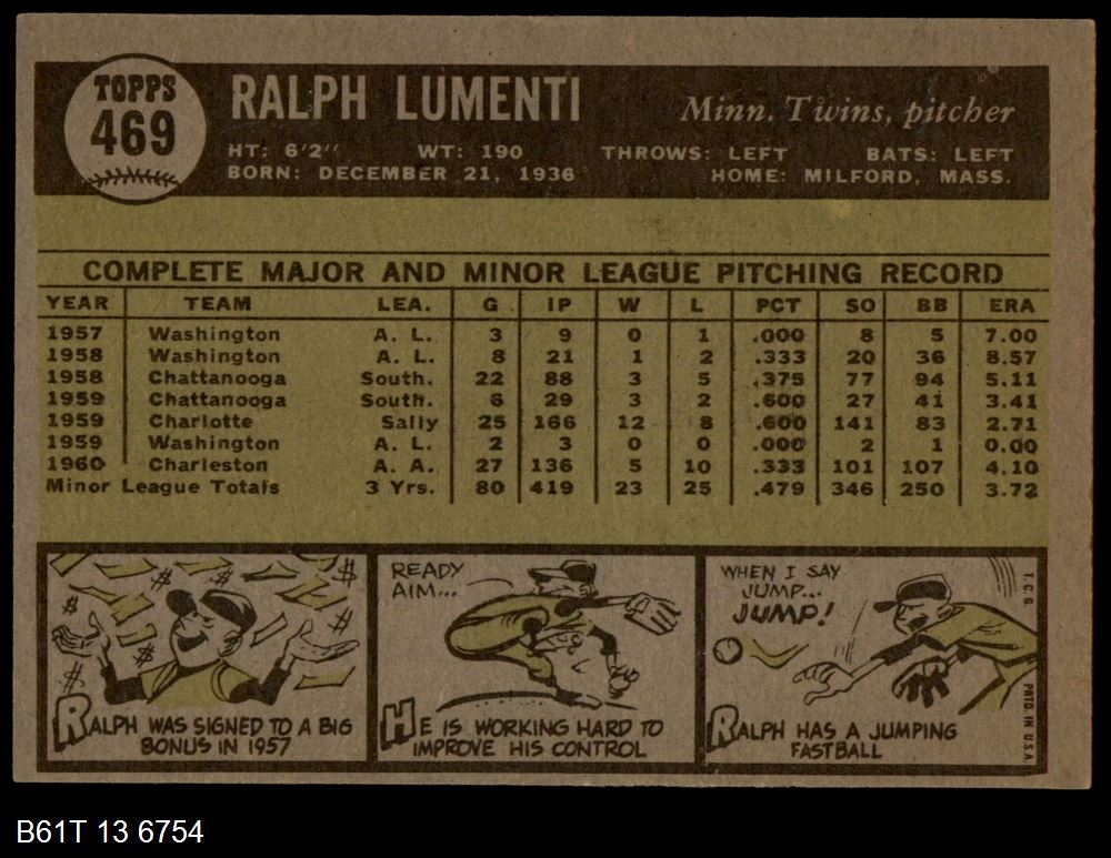 | 1961 Topps #469 Ralph Lumenti | 5 - EX | Front | Back |