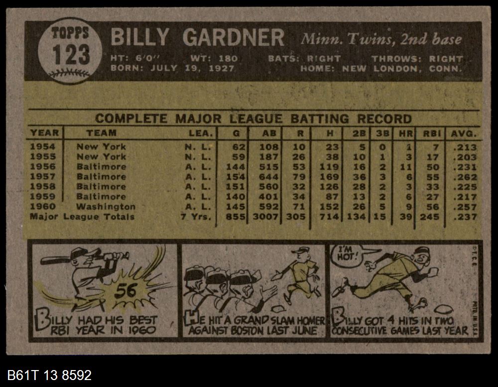 | 1961 Topps #123 Billy Gardner | 6 - EX/MT | Front | Back |