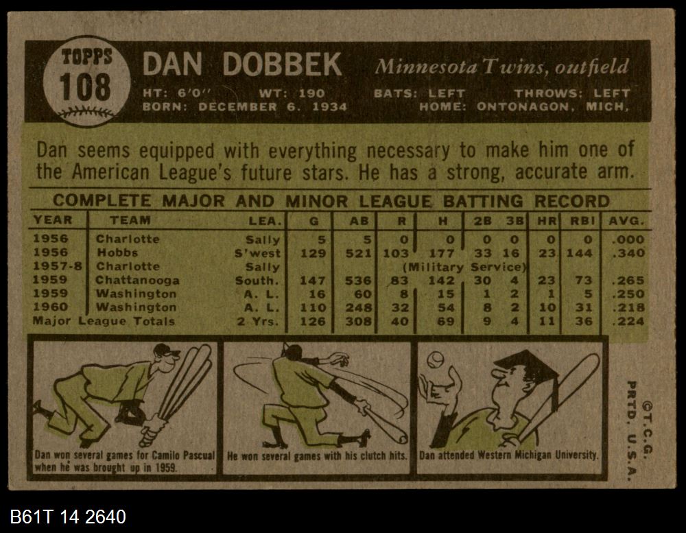 | 1961 Topps #108 Dan Dobbek | 4 - VG/EX | Front | Back |